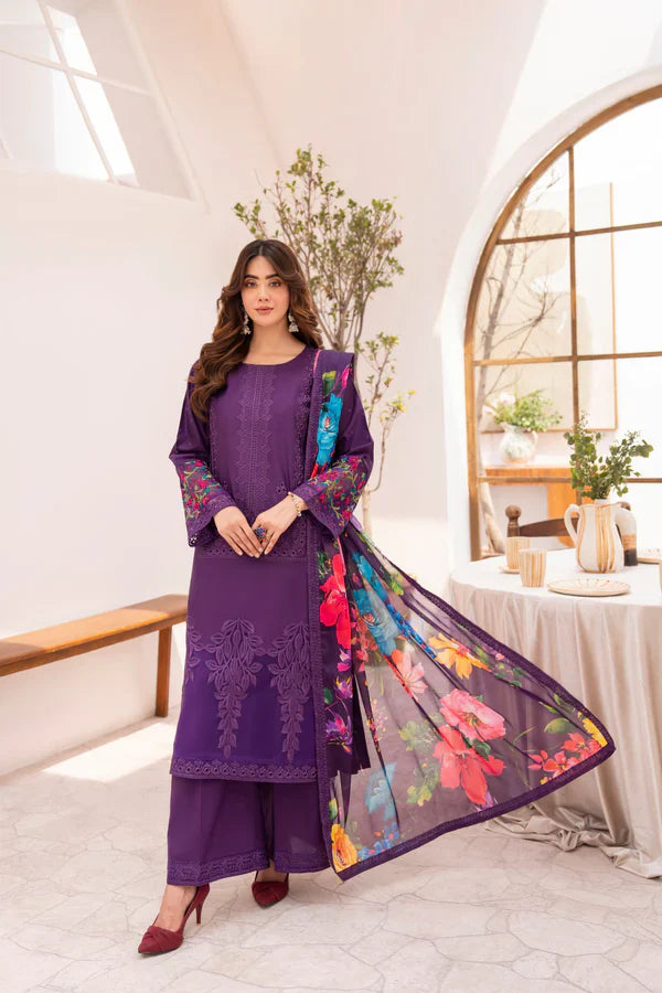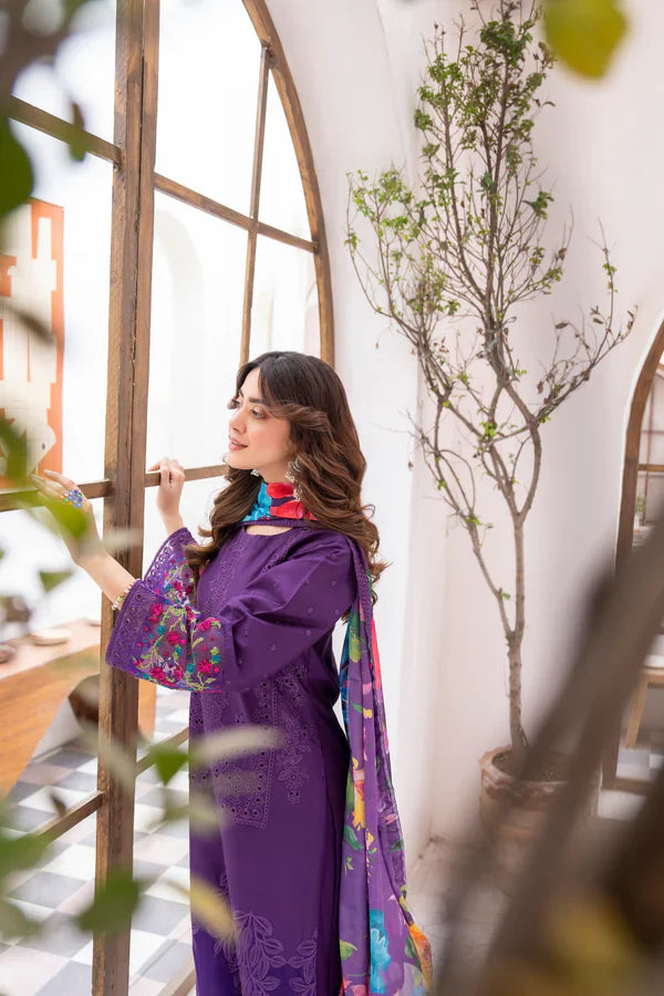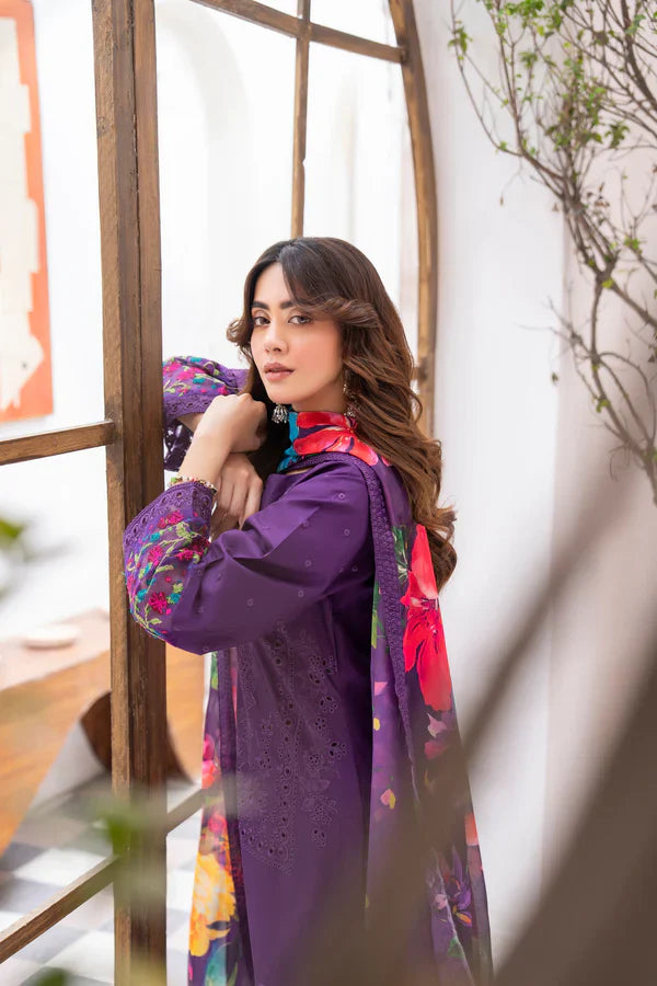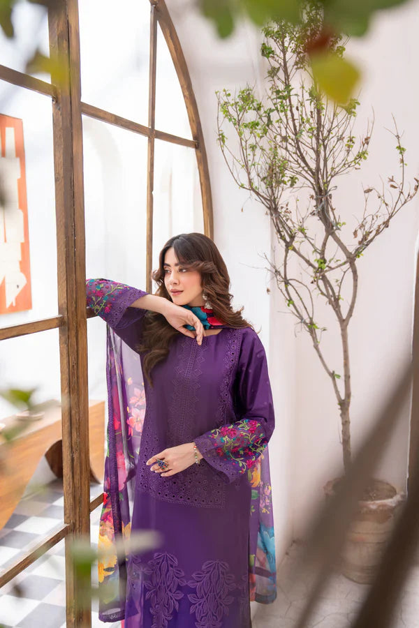 Violet echoes dusky twilight with Chikankari and cross-stitch accents on sleeves, finished by organza-border details. A multi pure silk dupatta draped in lace shimmers like evening blossoms, while loose trousers bearing an embroidered patch complete the poetic vibe. Ideal for festivals where you want to shine quietly.