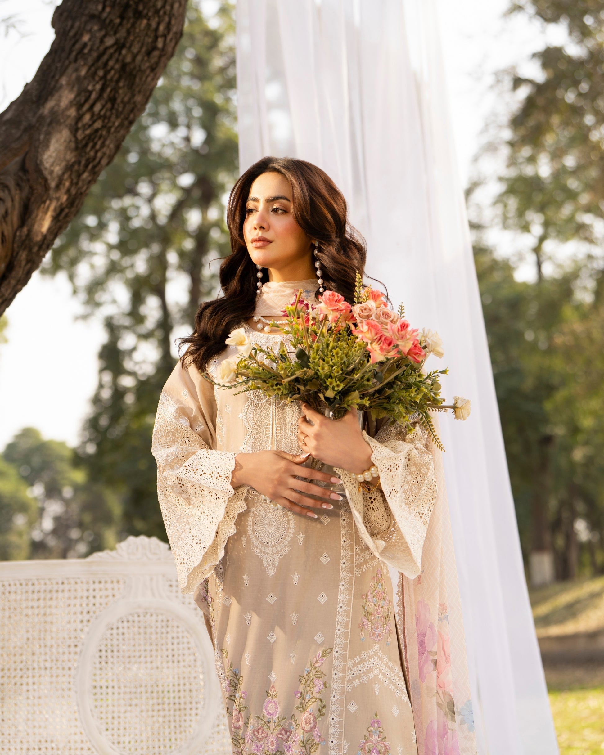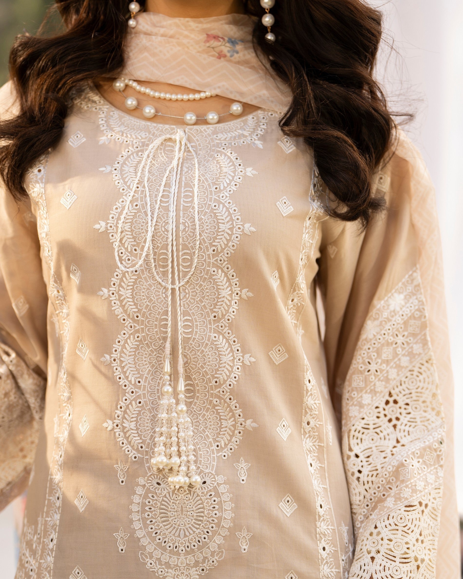 Dupatta: Printed lawn dupatta adorned with lace on all sides, adding softness and visual charm to the outfit.