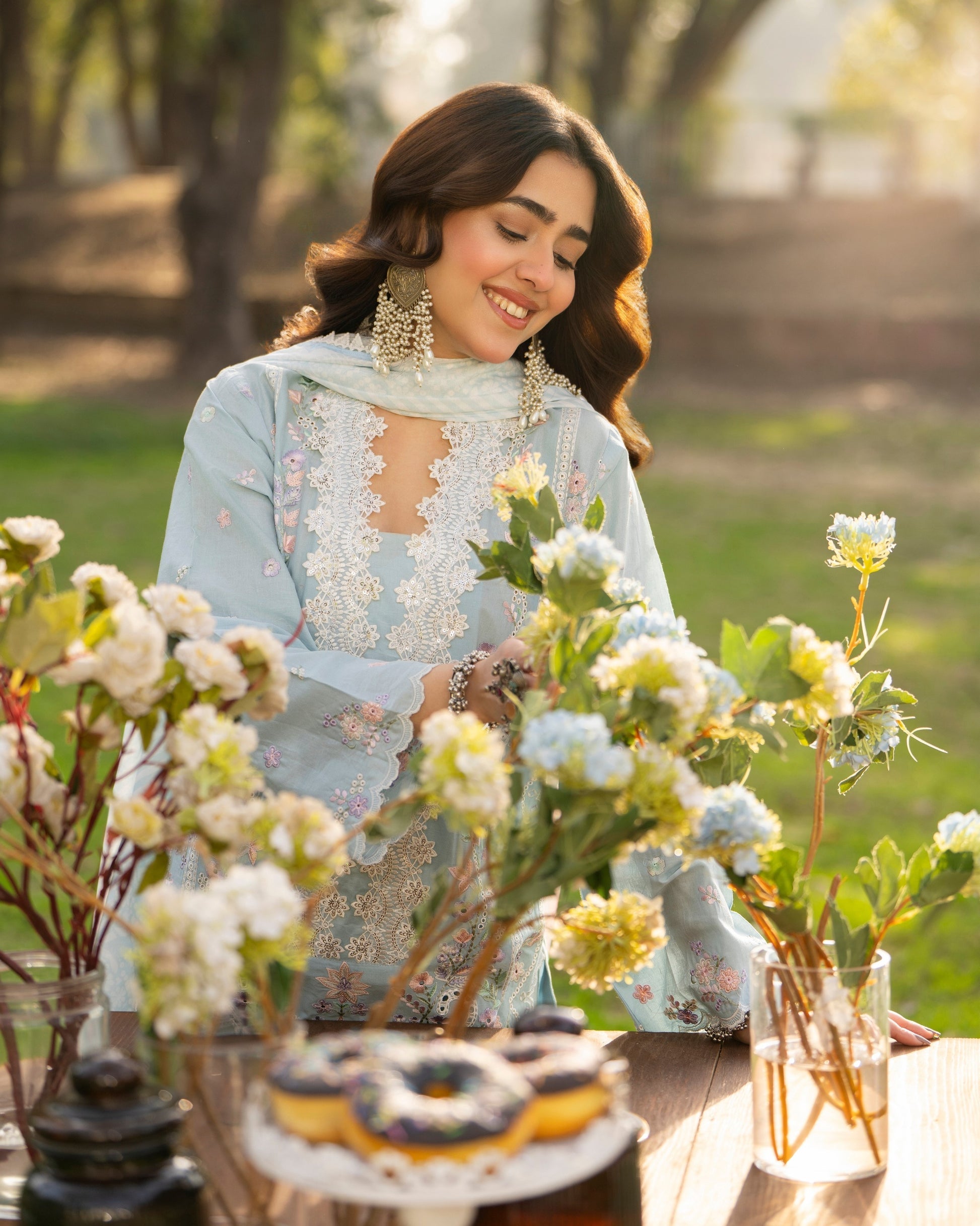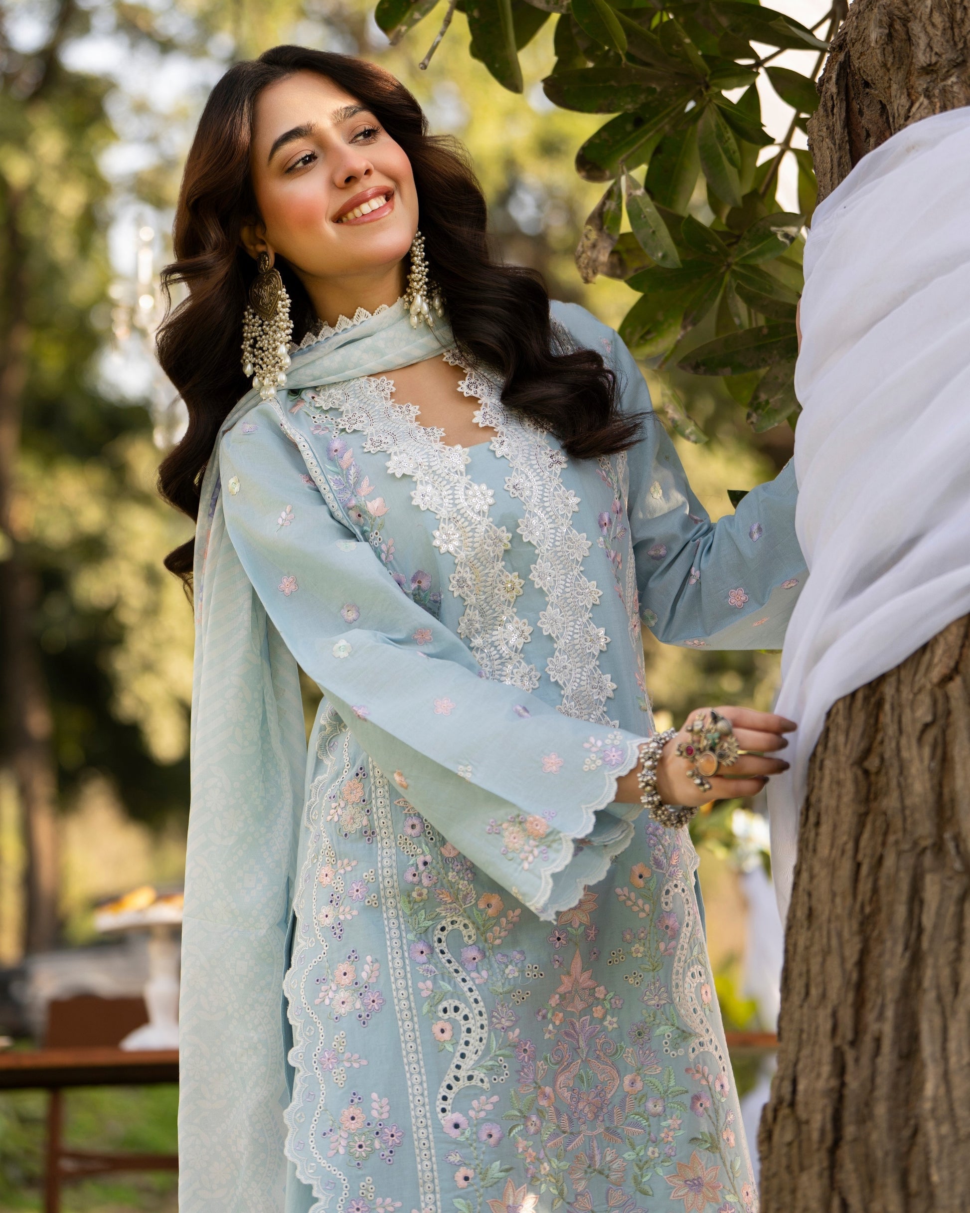 Dupatta: Printed lawn dupatta framed with all-around milky lace, adding softness and a classic feminine touch.
