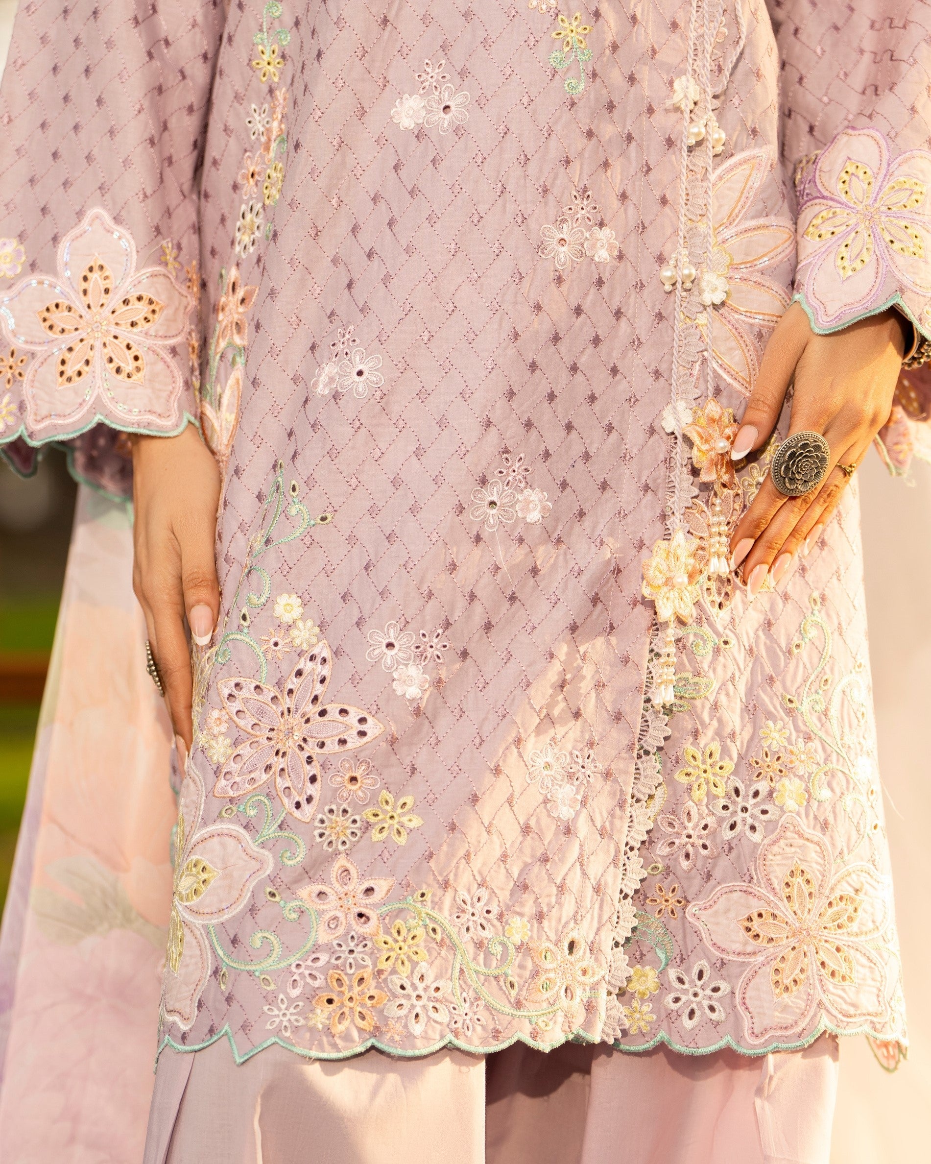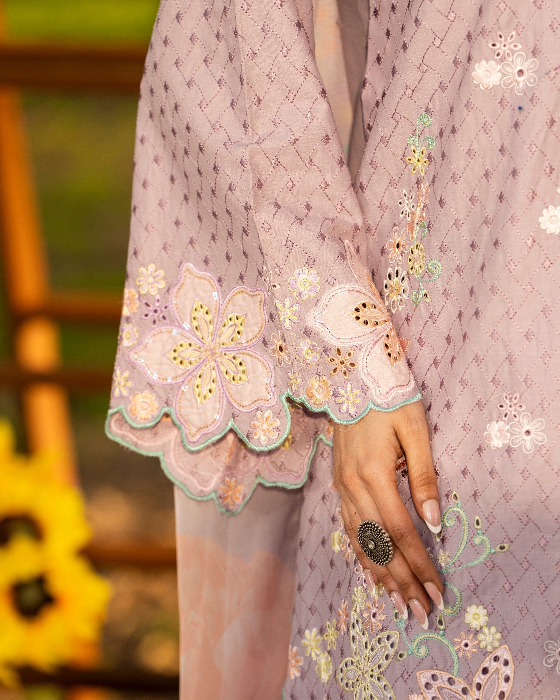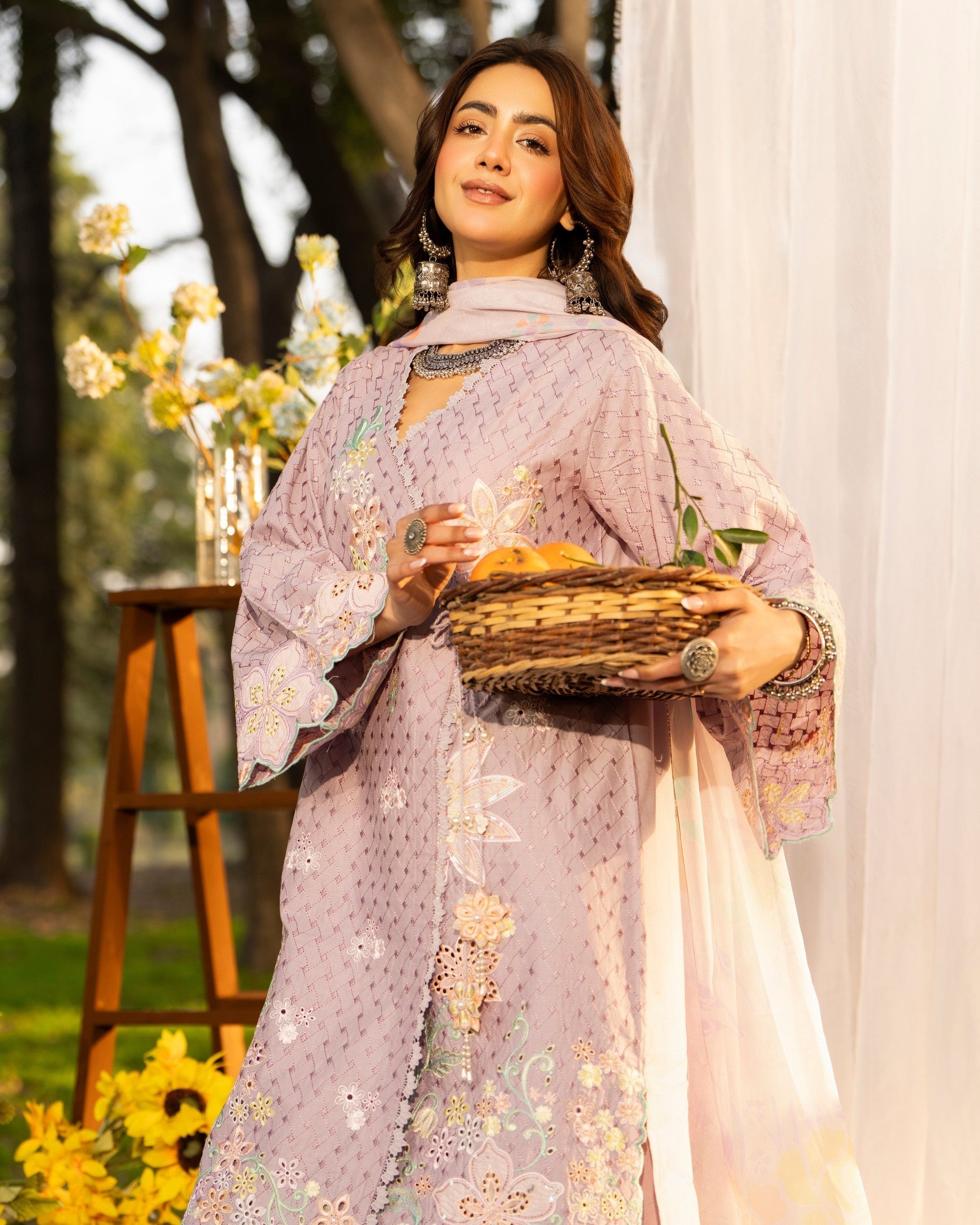 Dupatta: Printed silk dupatta finished with all-around milky lace, adding softness and a luxurious drape.