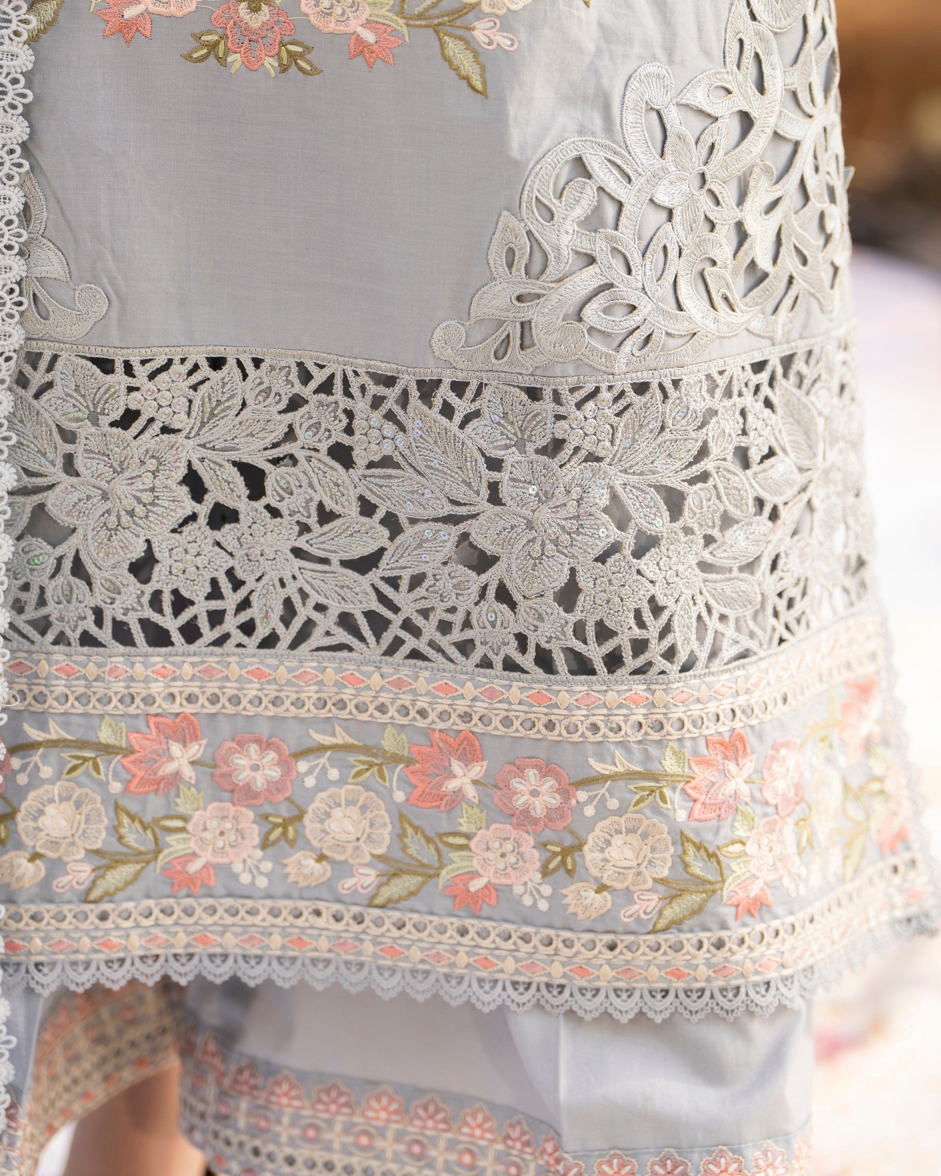 Shirt: Long boring chikankari shirt featuring cutwork patches, intricate laces, and embroidered motifs, further enhanced with patch and motif detailing along the border for a richly finished look.