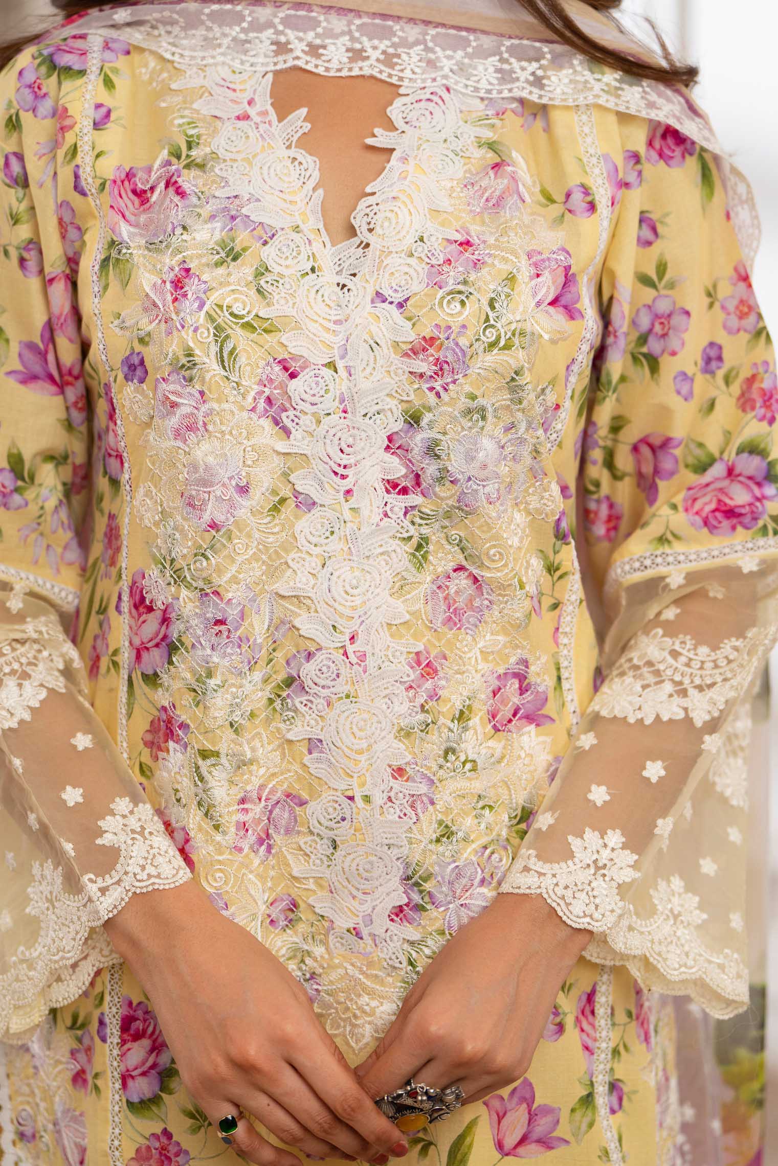Printed Shirt with Neckline and Cutwork Patch on Border and Shuttle Lace Work