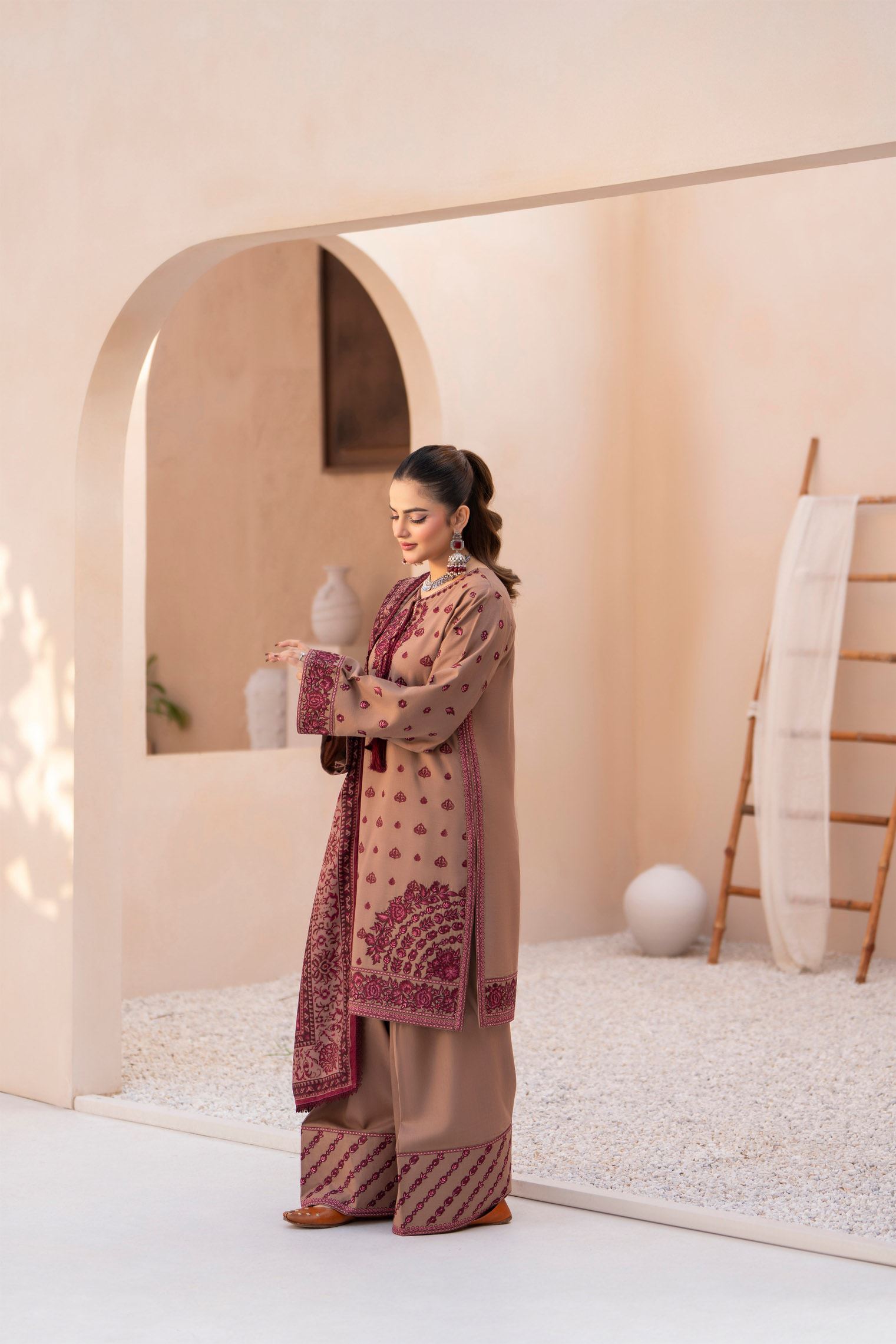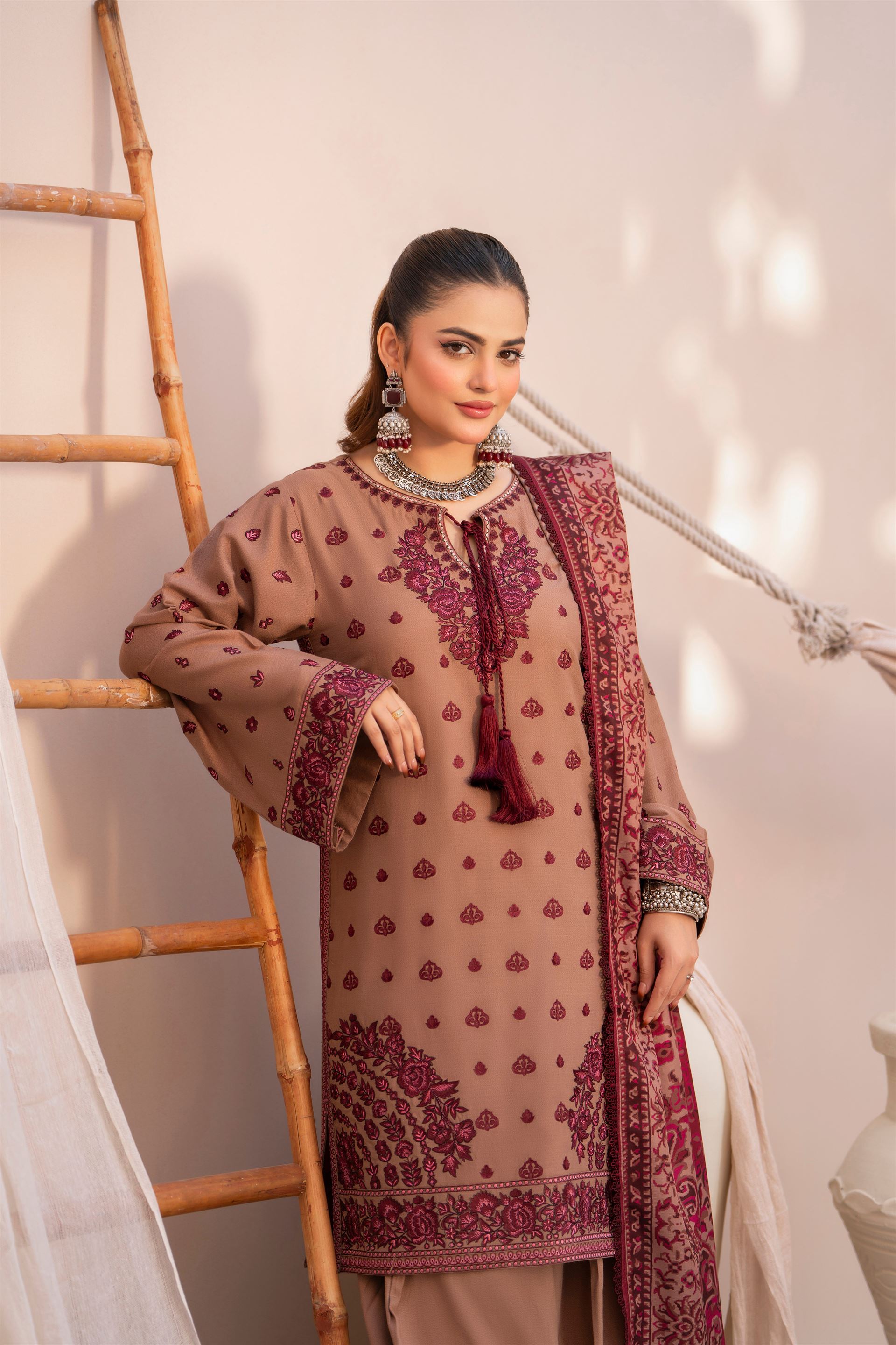 Discover the perfect look. Its cozy Dhanak texture, graceful embroidery, and elegant winter styling make it ideal for dawat wear, outings, and everyday chic comfort. Designed to keep you warm and stylish, this outfit adds charm to every moment.