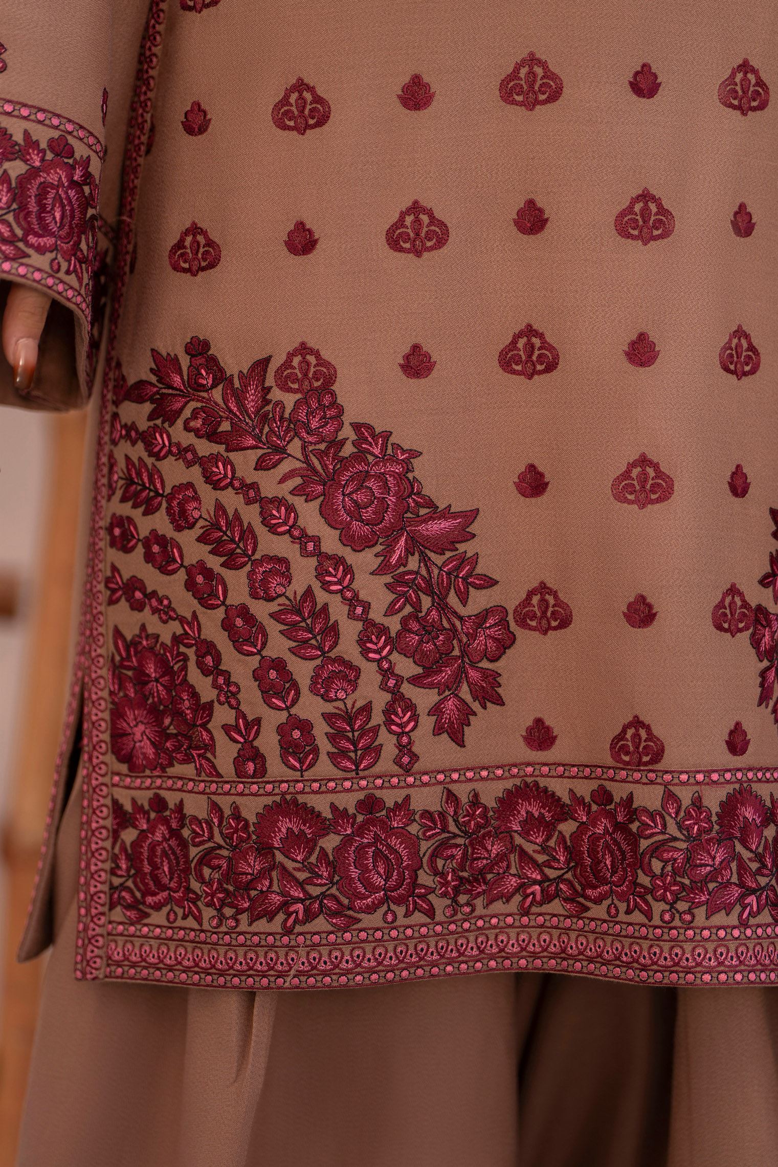 Shirt: Dhanak embroidered short shirt, enhanced with a beautifully detailed dori neckline for a refined winter look.