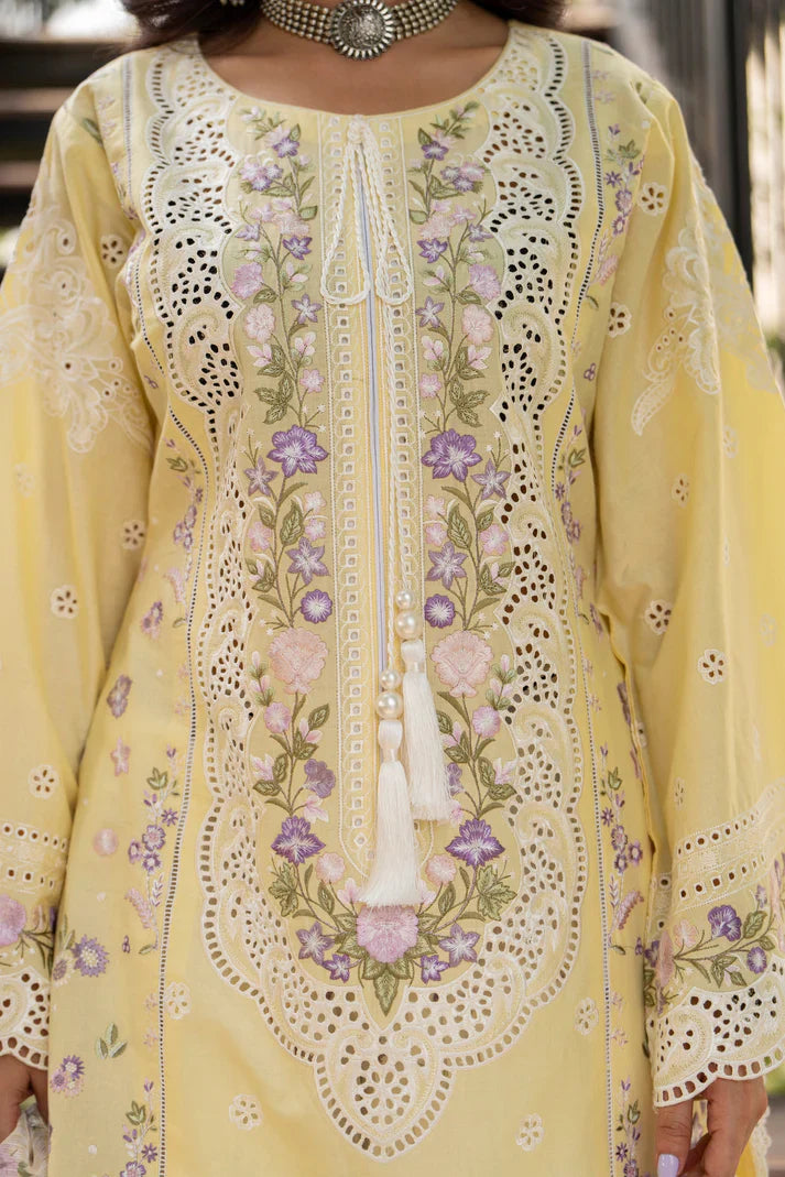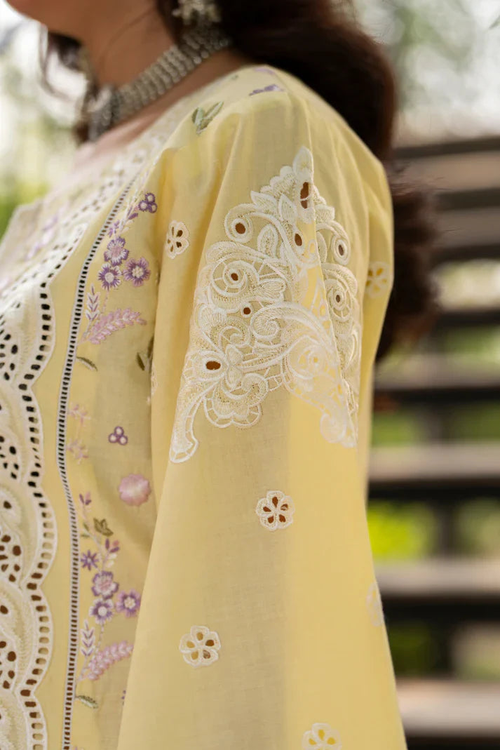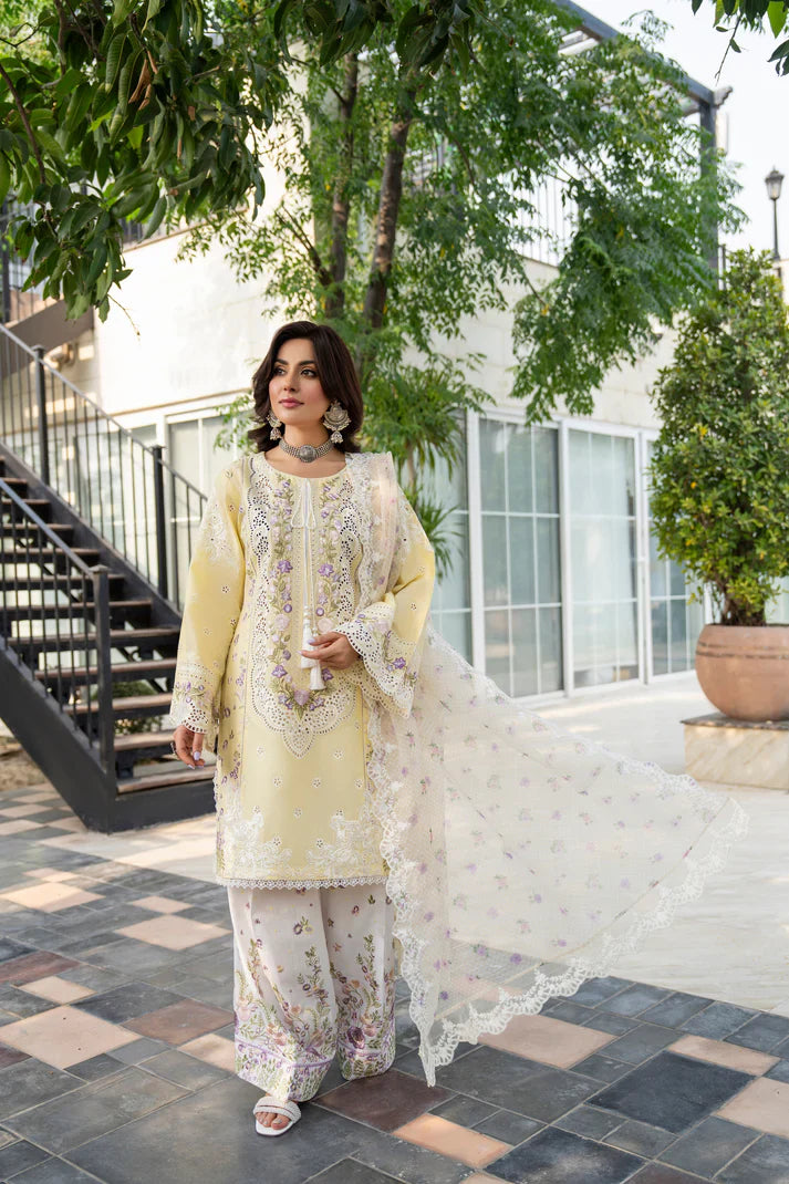 This radiant 3PC ready-to-wear set in Sunlit features a short shirt rich with Chikankari multi-thread embroidery, organza cut-work patches and dori, tassel accents on the neckline, and lace detailing, capturing artisanal beauty. The digital-printed dupatta with all-around embroidery flows gracefully, paired with fully embroidered Farshi shalwar trousers with an elasticized waistband for a luxe, comfortable finish.
