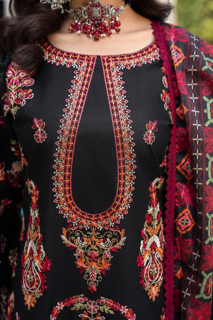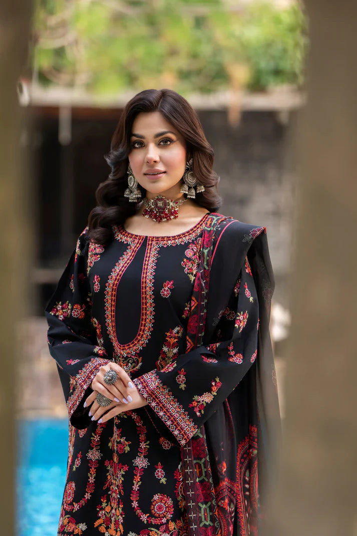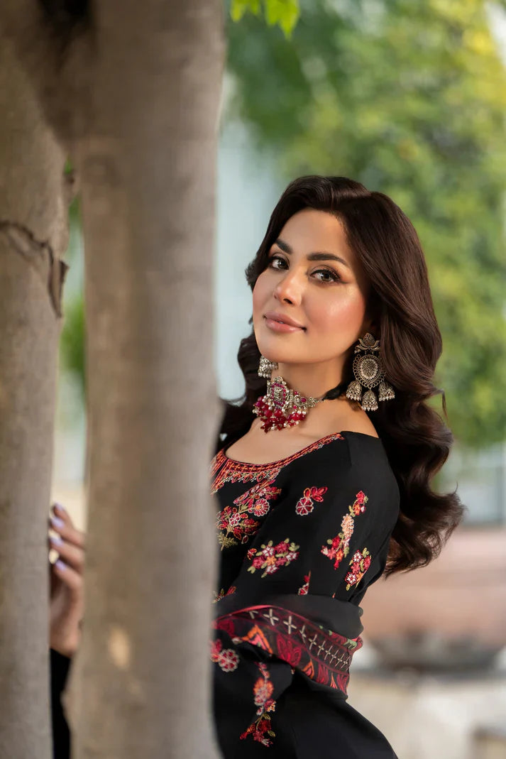 This elegant 3PC ready-to-wear ensemble in Deep Black features a short shirt adorned with fully multi Chikankari Kashmiri embroidery, lending it a timeless, artisanal flair. The coordinating pure apple silk dupatta is finished with an all-over shuttle lace border, adding luxurious texture and movement. Completing the look are Farshi shalwar trousers with an elasticized waistband and an embroidered patch detail, blending traditional appeal with modern comfort.
