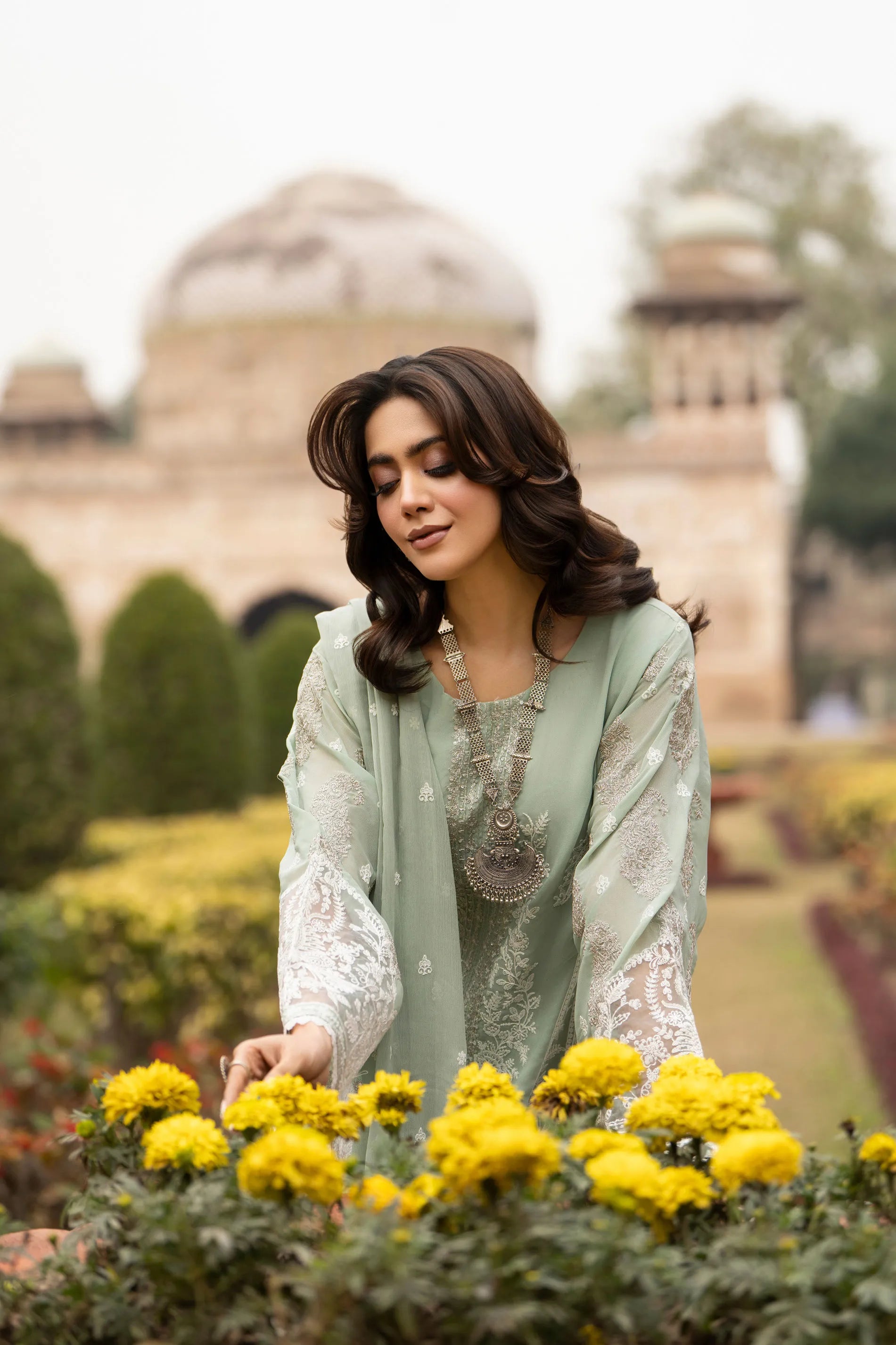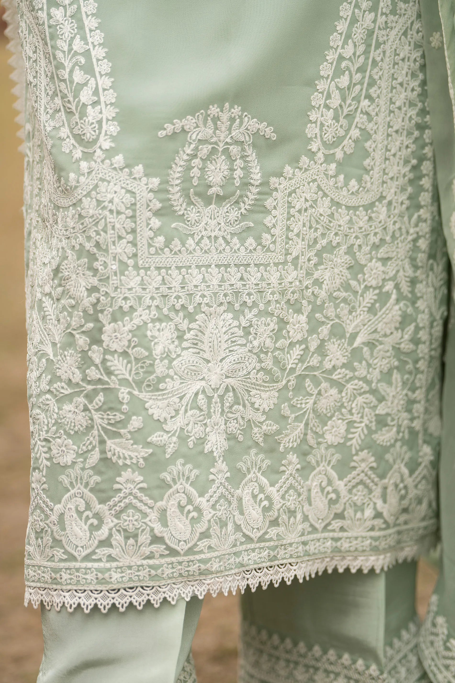 Georgette Long Shirt with Matte Thread Embroidery and Lace on Chalk