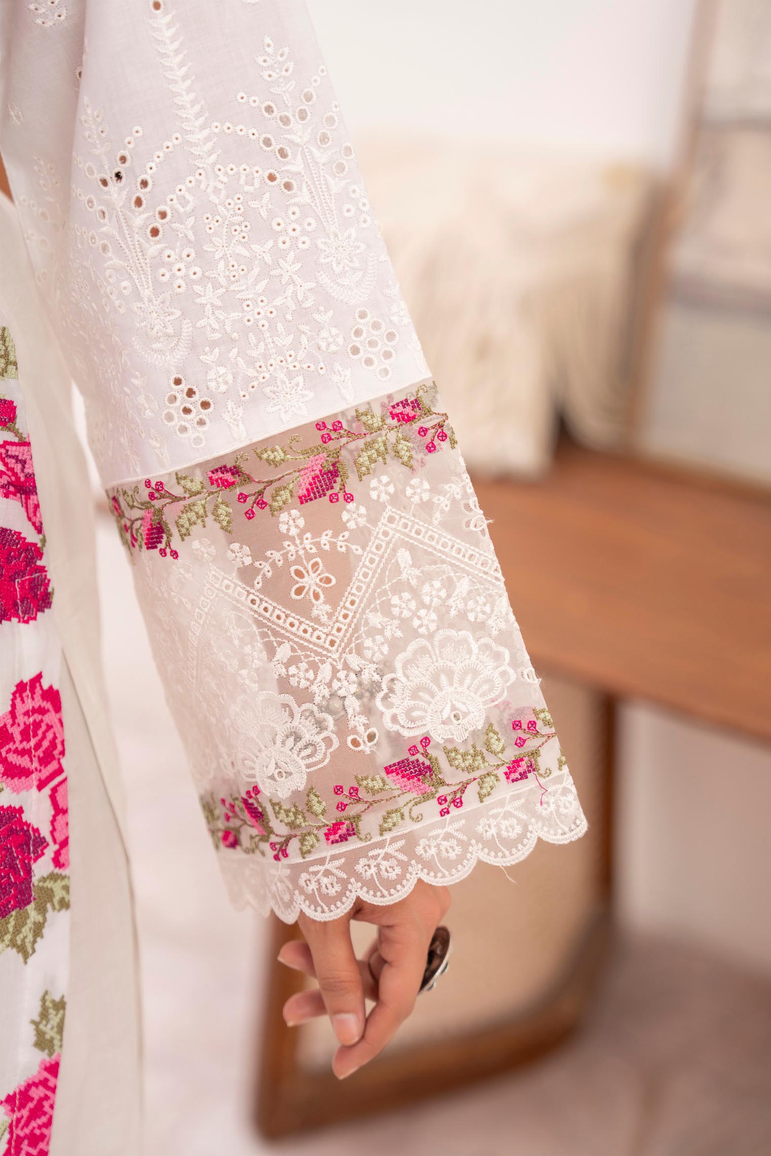 Shirt with Cross-stitch Multi Embroidery and Lace on Sleeves with