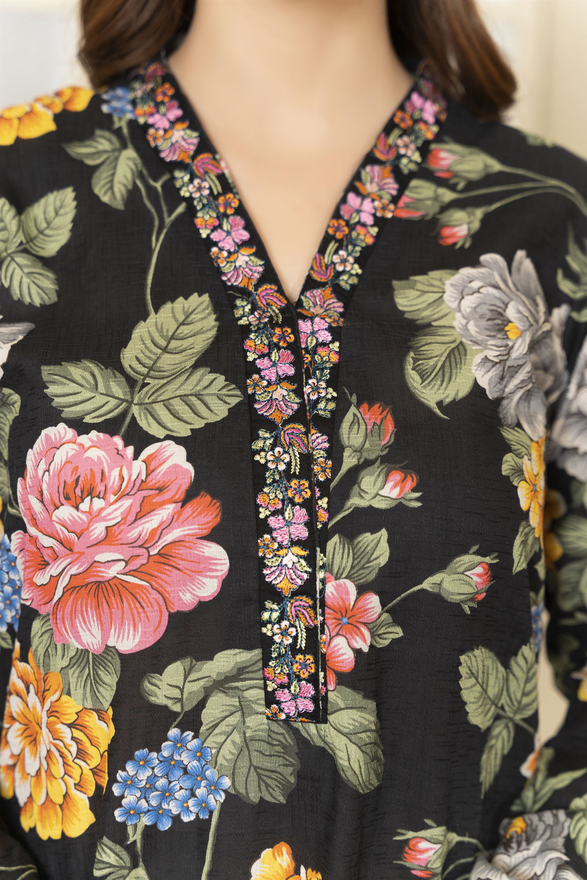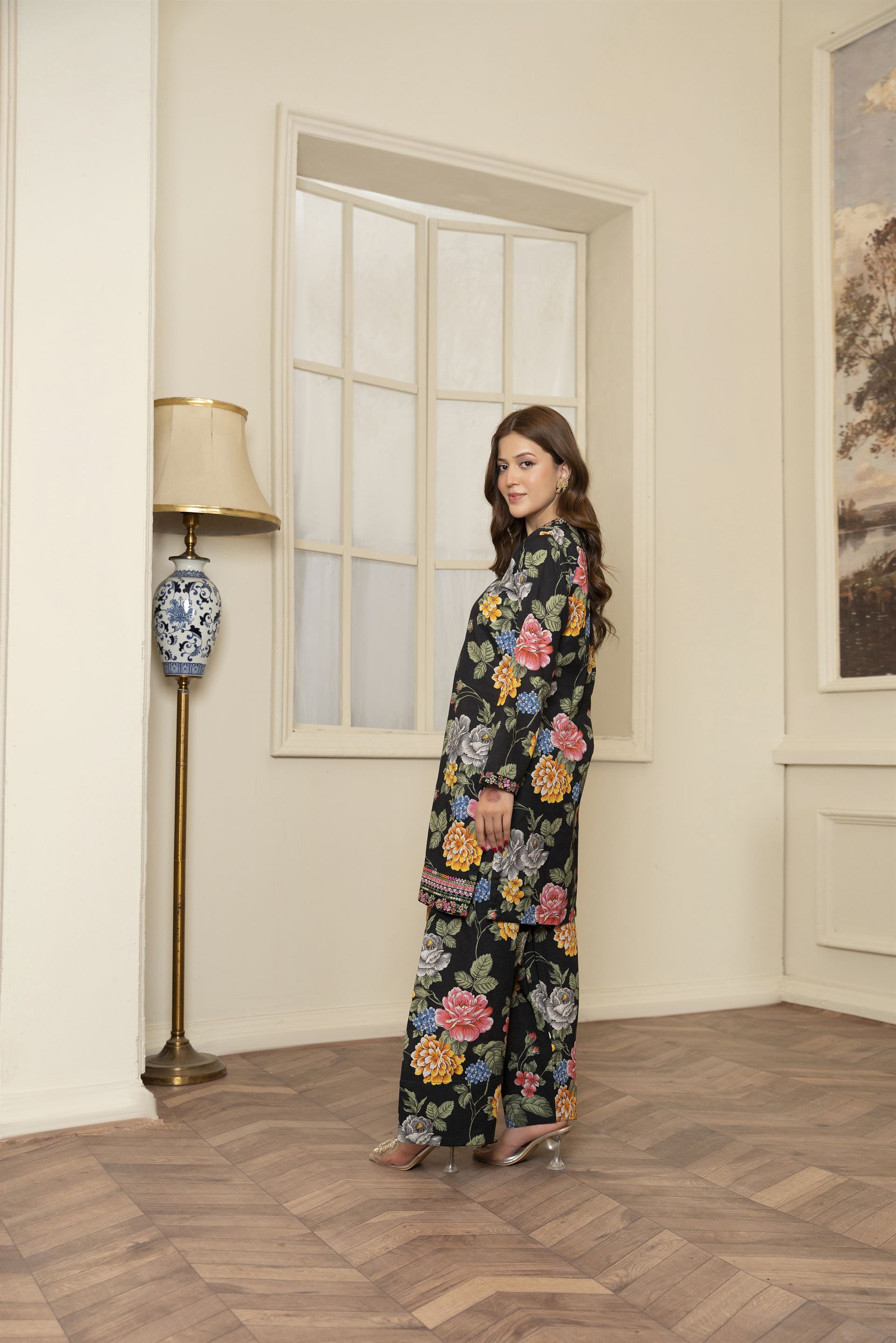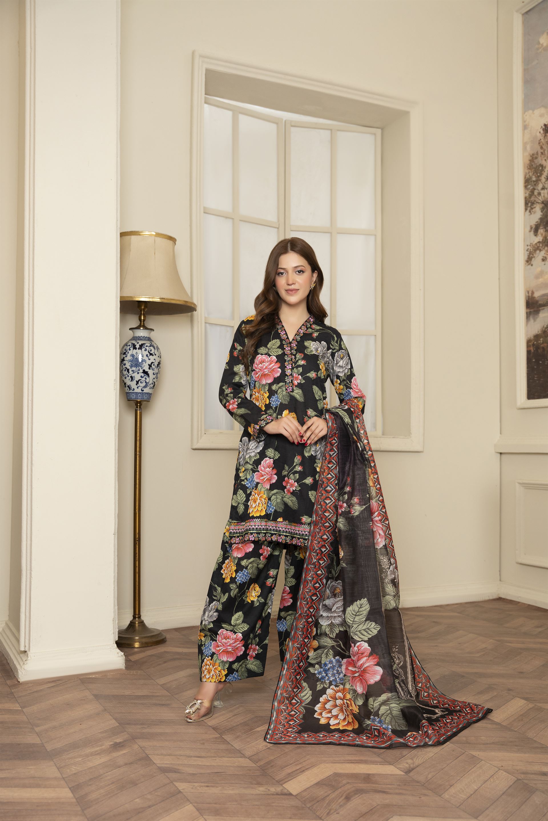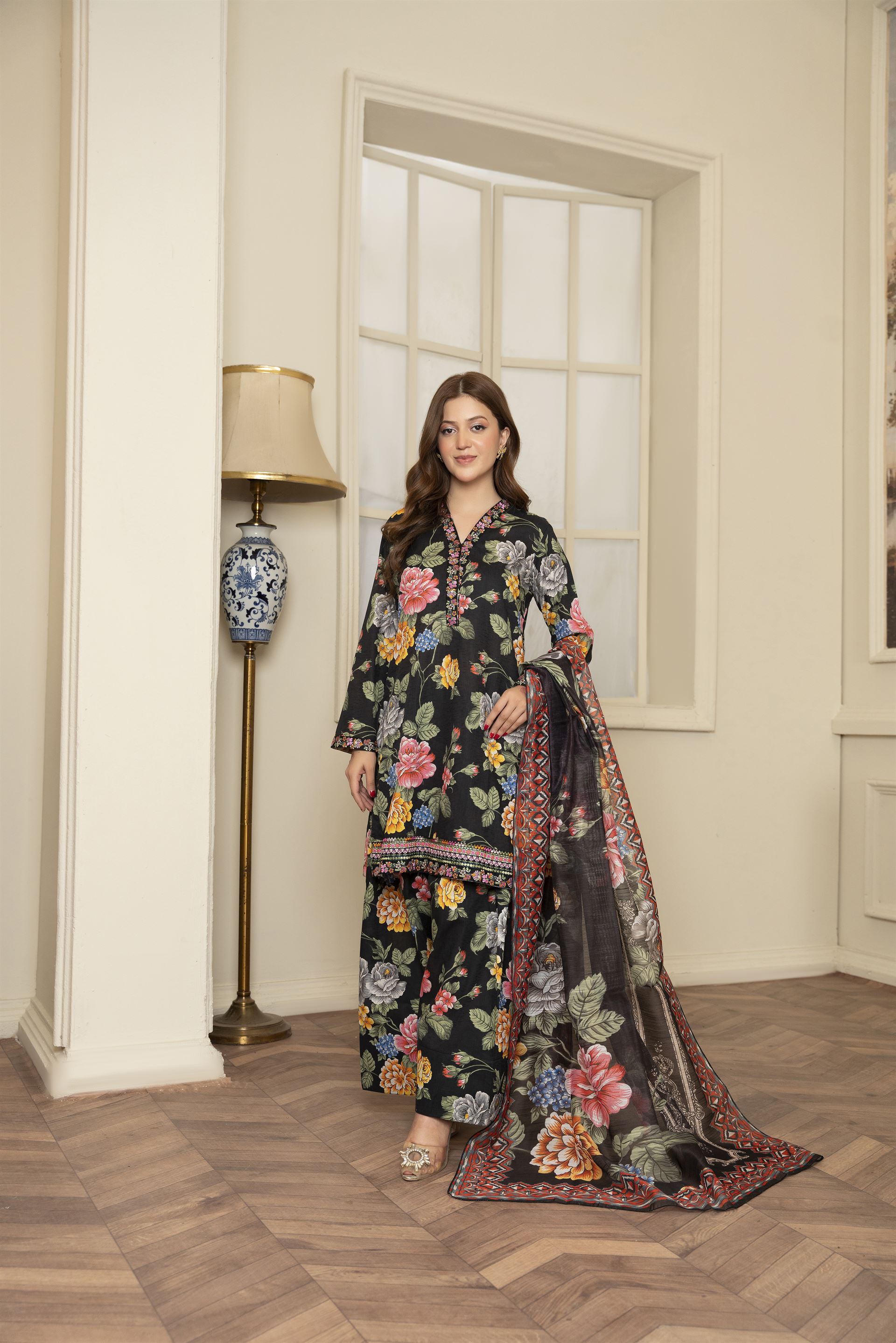 Catherine is a chic 3-piece ensemble featuring exquisite printwork that adds a touch of modern flair. Paired with a traditional farshi shalwar, it offers a perfect balance of elegance and style.