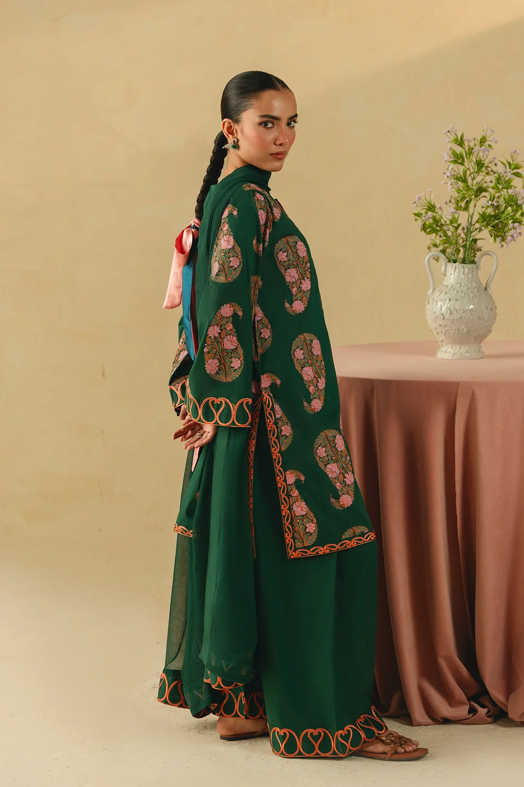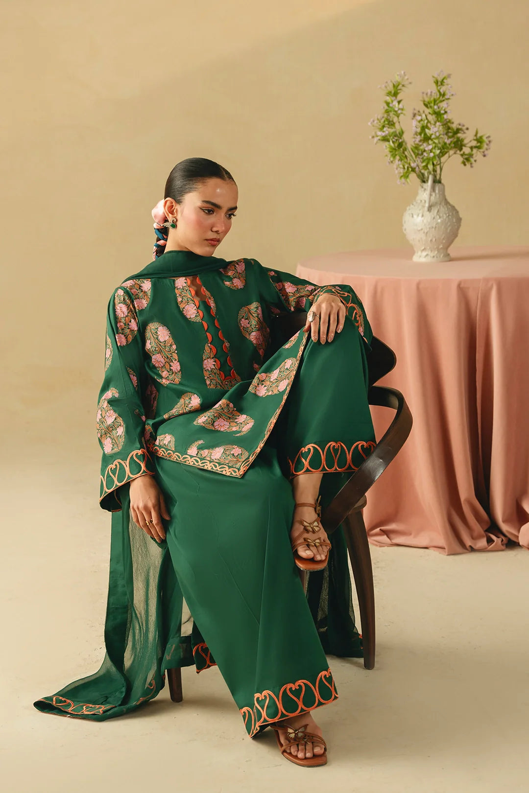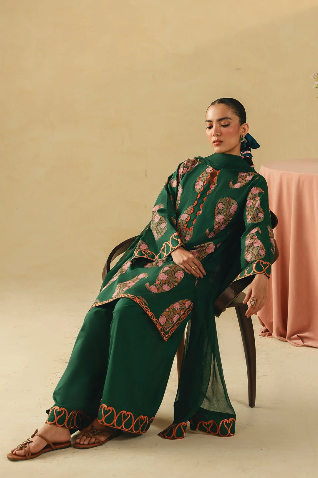 • A sophisticated three-piece bottle green ensemble featuring a screen-printed shirt adorned with intricate embroidery on the sleeves and hem. Paired with a farshi shalwar embellished with delicate threadwork and a coordinating chiffon embroidered dupatta, this outfit offers a harmonious and refined look.