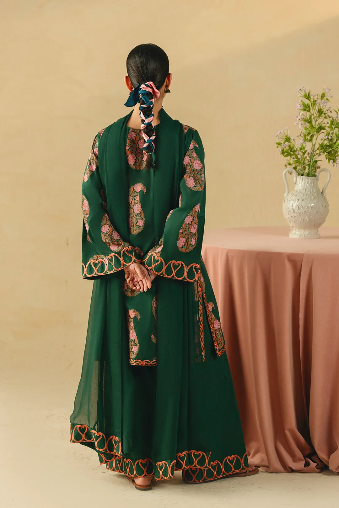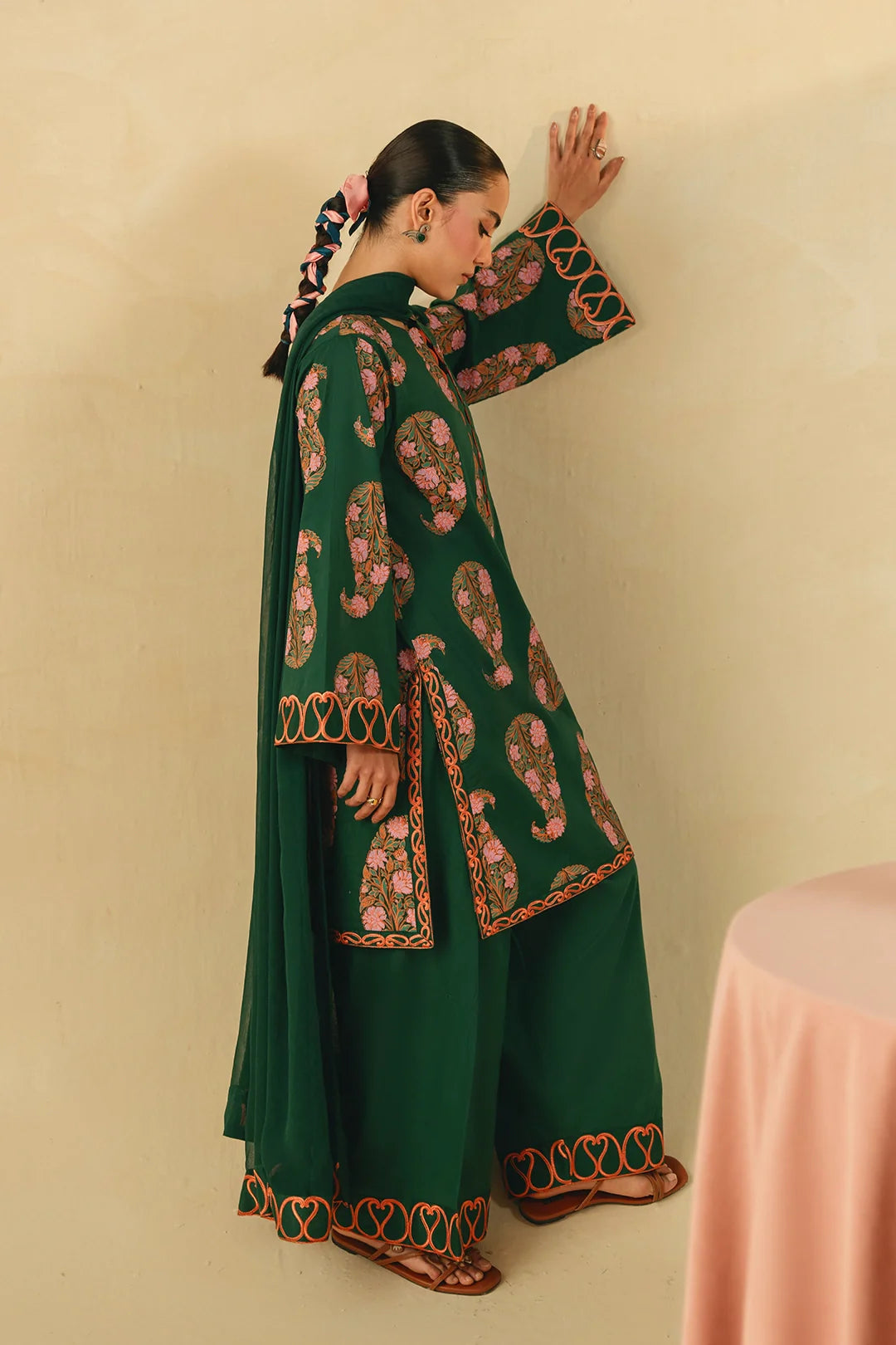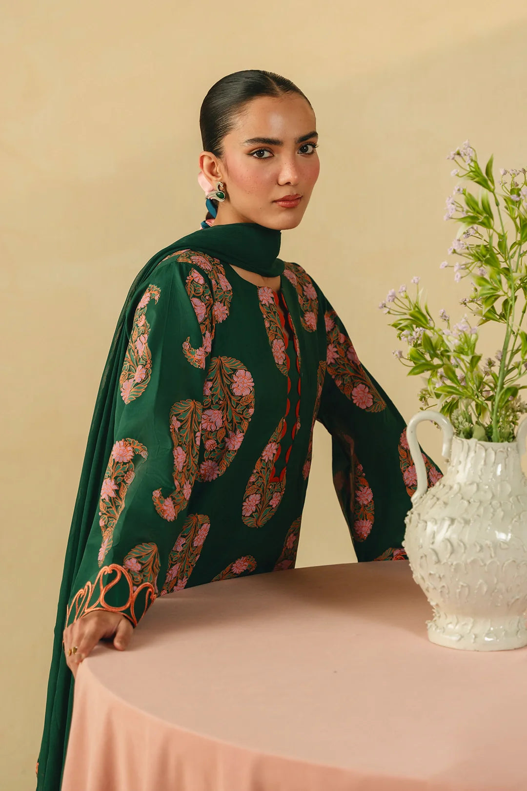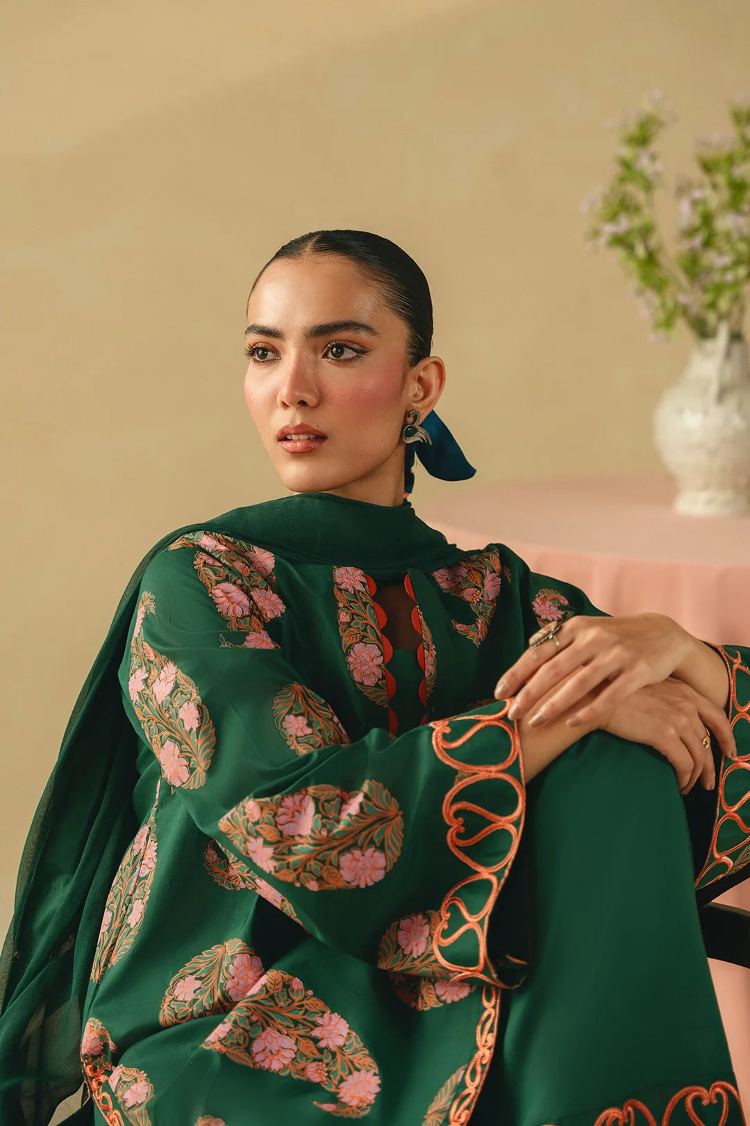 • A sophisticated three-piece bottle green ensemble featuring a screen-printed shirt adorned with intricate embroidery on the sleeves and hem. Paired with a farshi shalwar embellished with delicate threadwork and a coordinating chiffon embroidered dupatta, this outfit offers a harmonious and refined look.