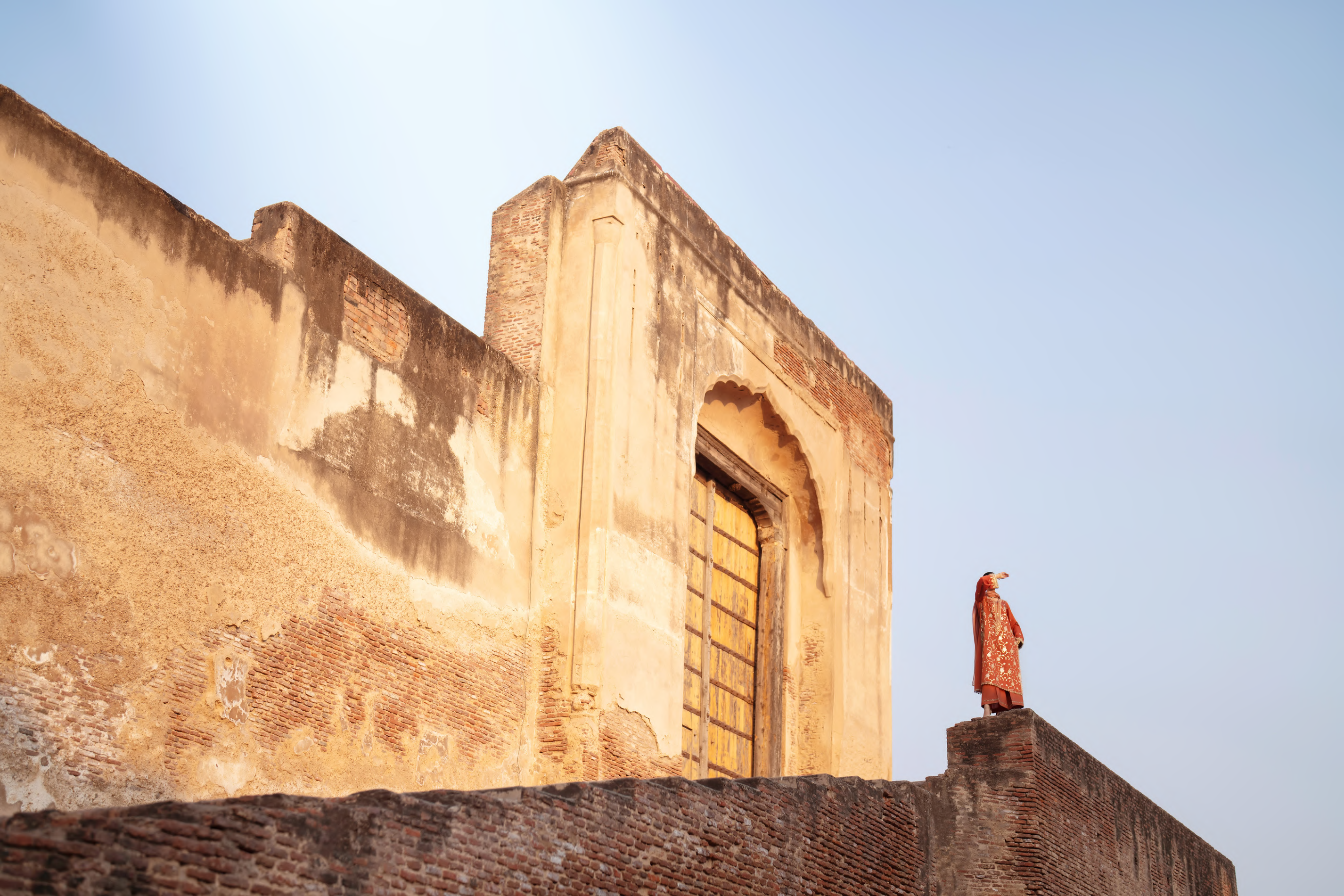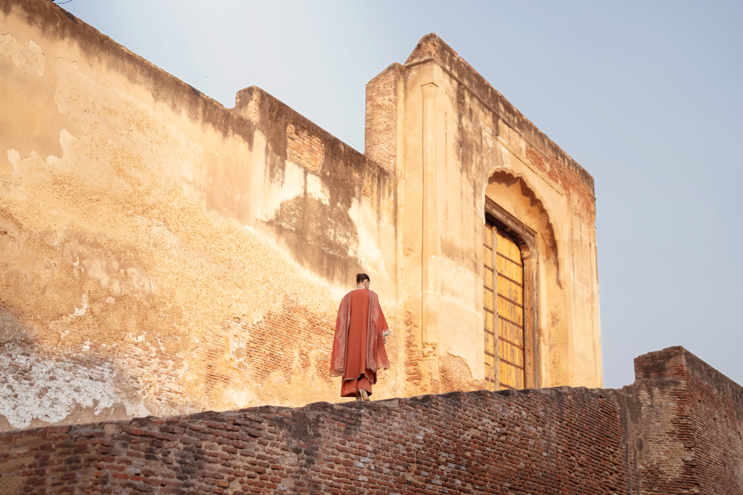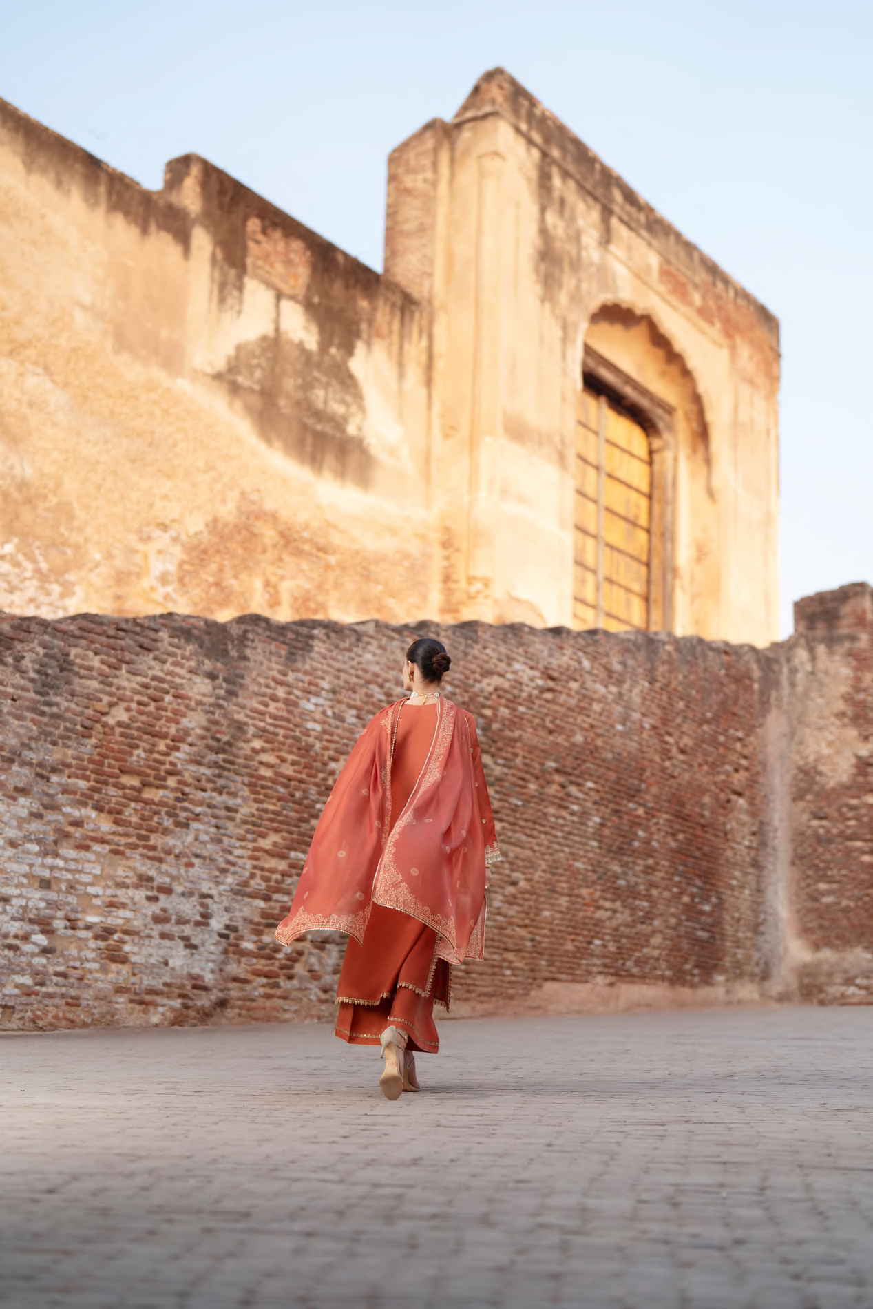 The kurta is adorned with intricate gold embroidery, featuring flowing floral vines and delicate detailing that lend depth and elegance to the silhouette.