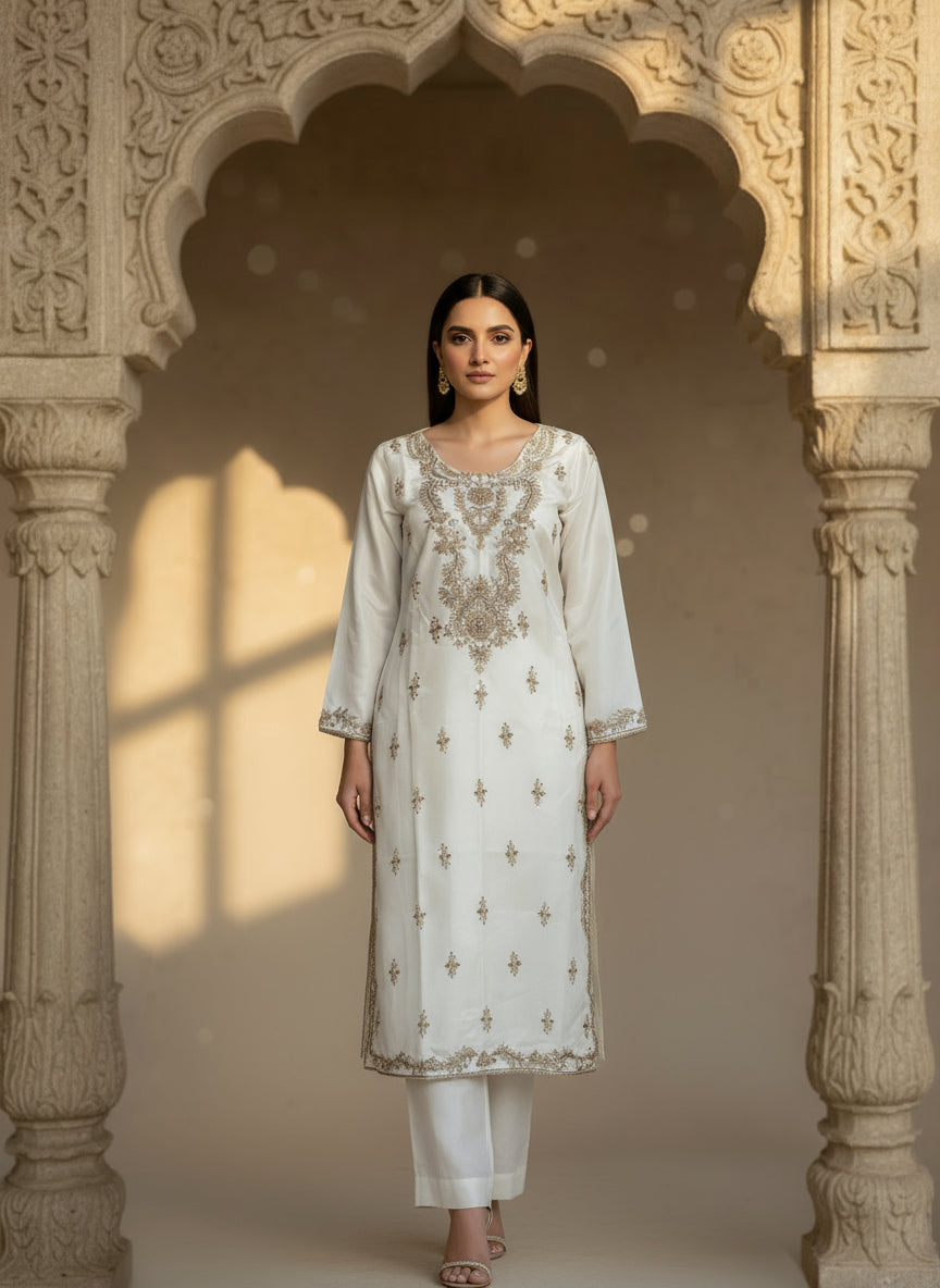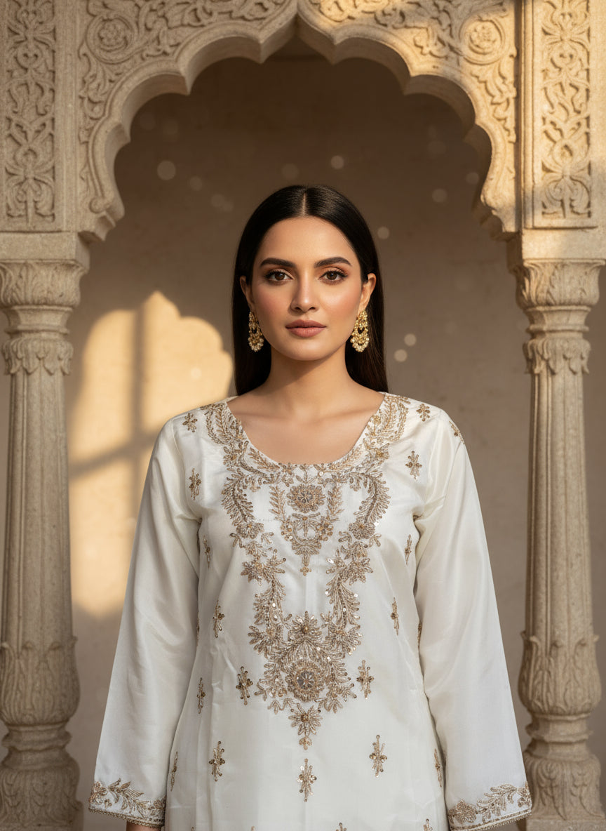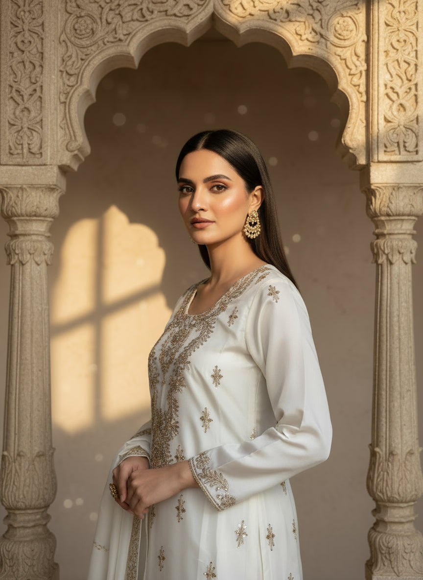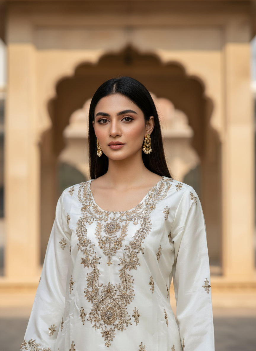 Crafted in premium silk from head to toe, this masterpiece exudes timeless elegance. The shirt and bottom flow effortlessly, while the silk dupatta is elevated with intricate hand embroidery. Adorned with kora, sequins, tilla, delicate threadwork, and pearls, every detail is a reflection of true artistry. Perfect for making a graceful statement at any occasion.