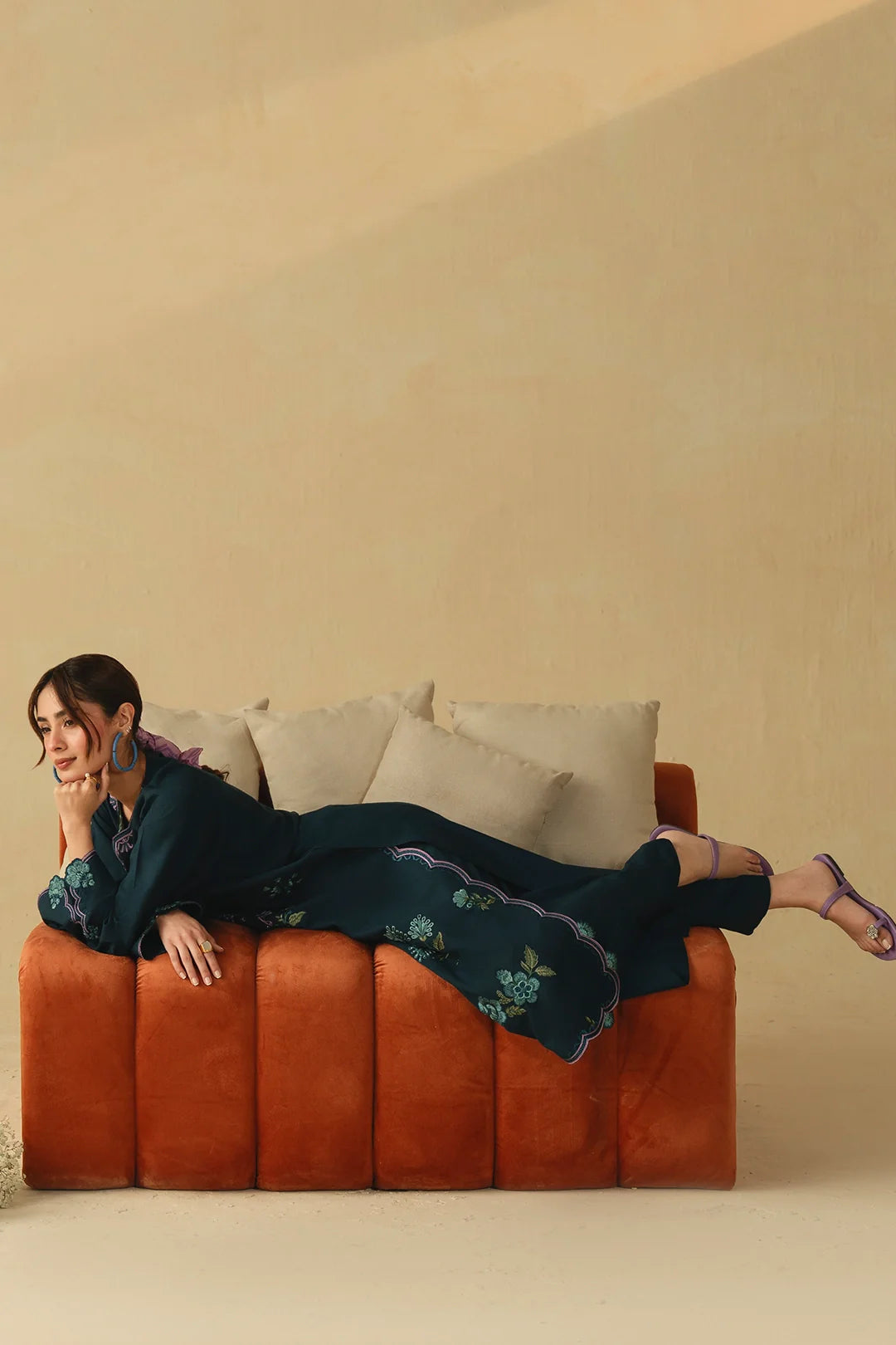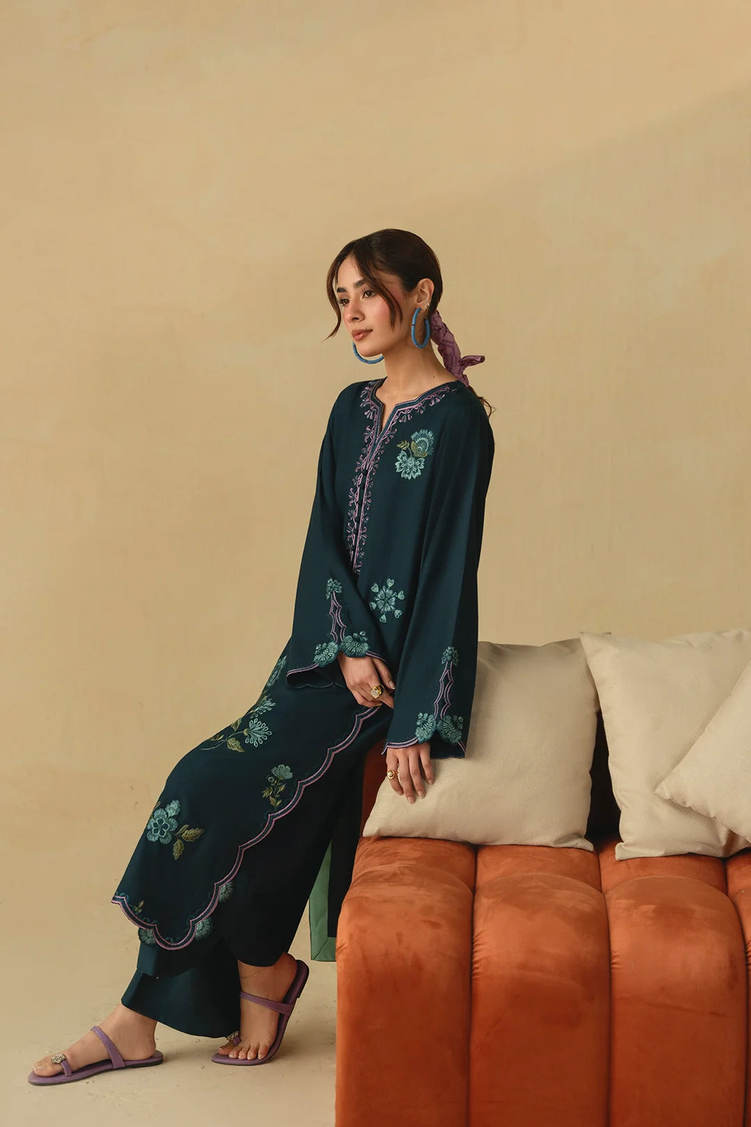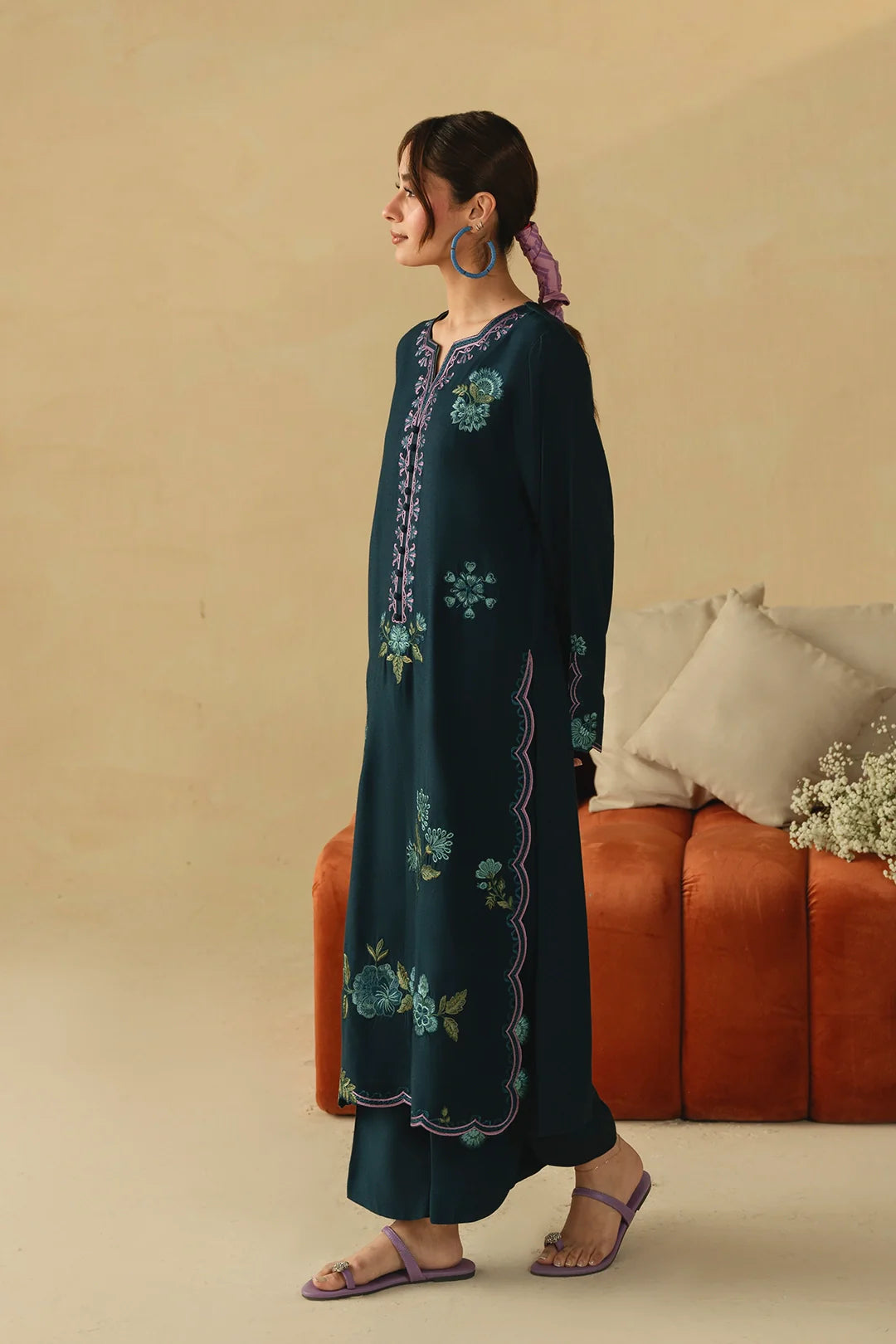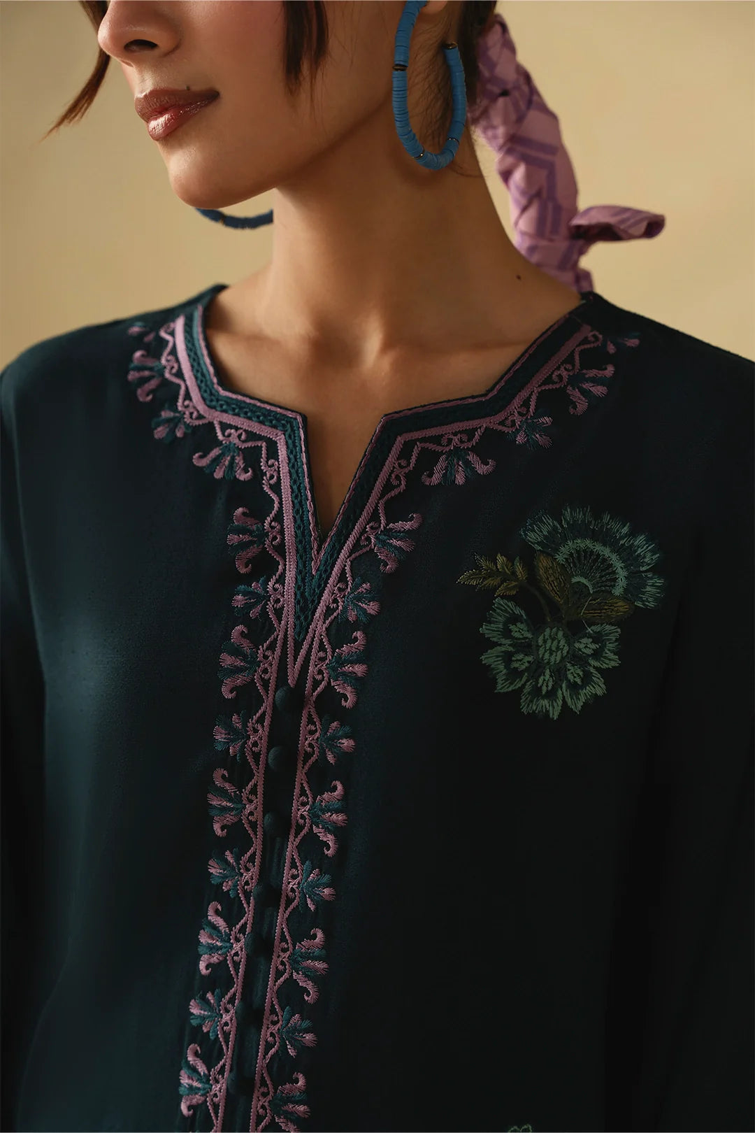 • A refined two-piece ensemble featuring a long embroidered shirt paired with wide-leg trousers, beautifully finished with delicate floral scalloping and intricate embroidery details for an elegant and timeless look.