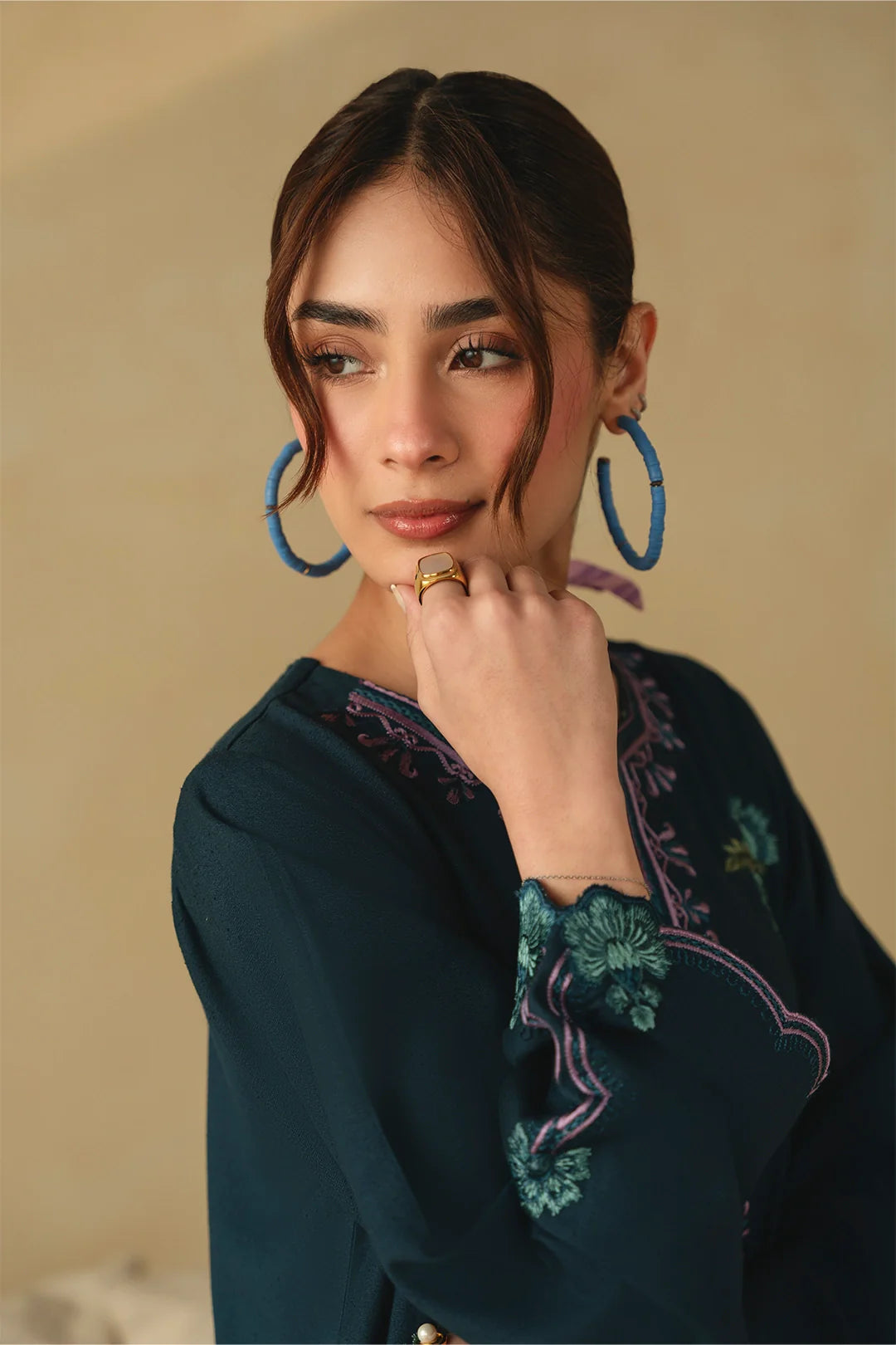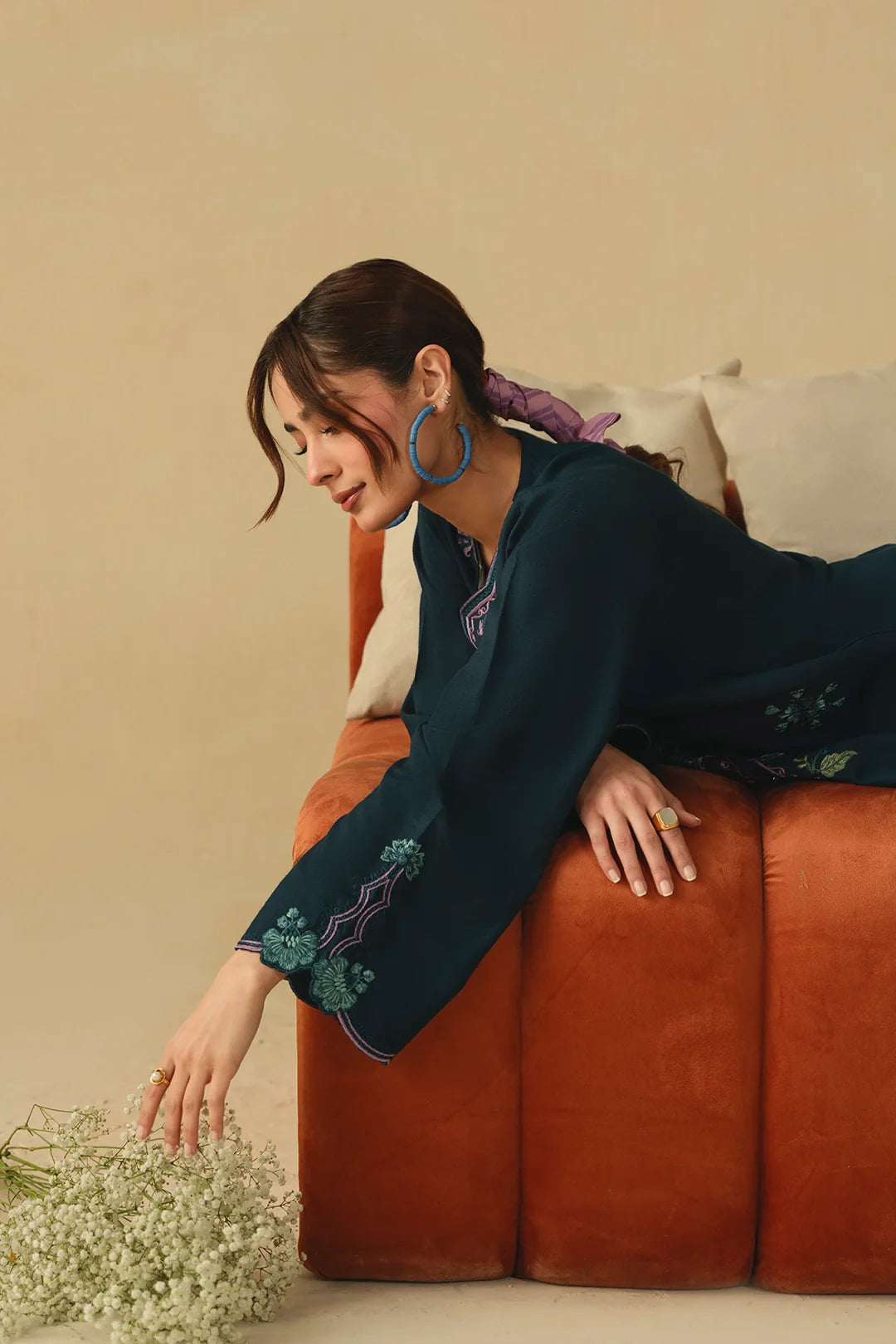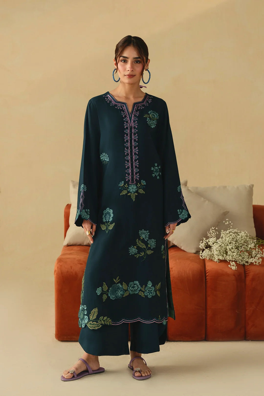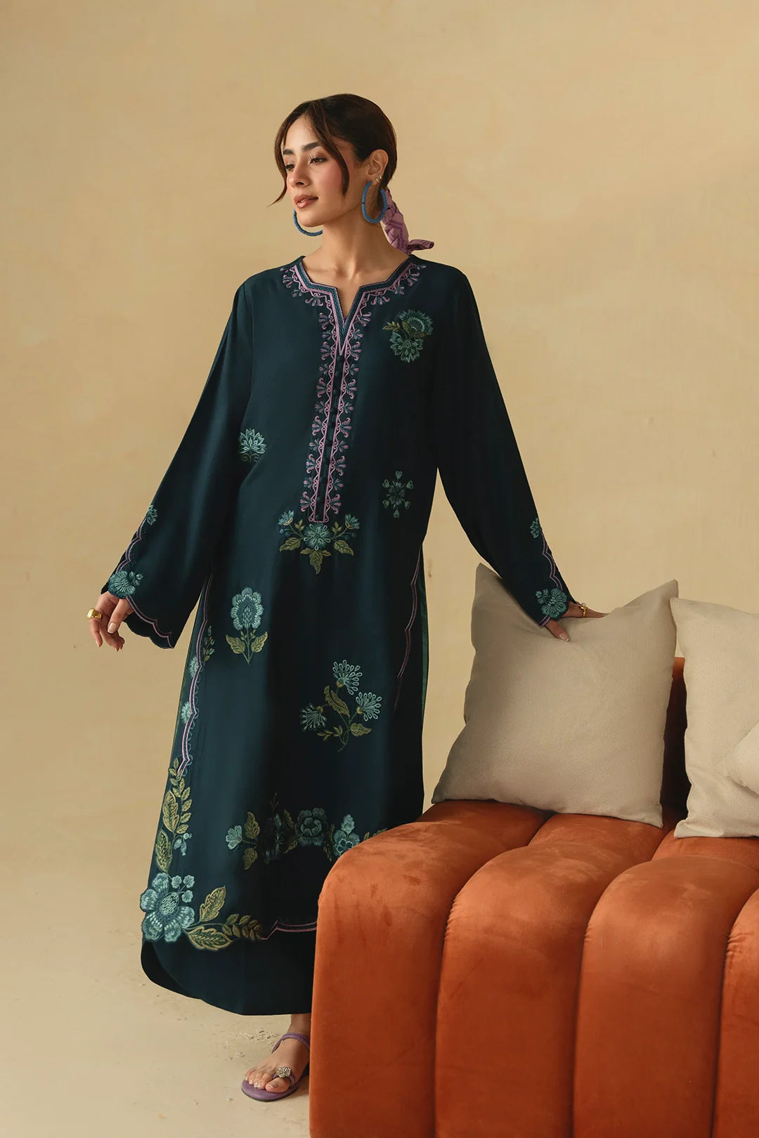 • A refined two-piece ensemble featuring a long embroidered shirt paired with wide-leg trousers, beautifully finished with delicate floral scalloping and intricate embroidery details for an elegant and timeless look.