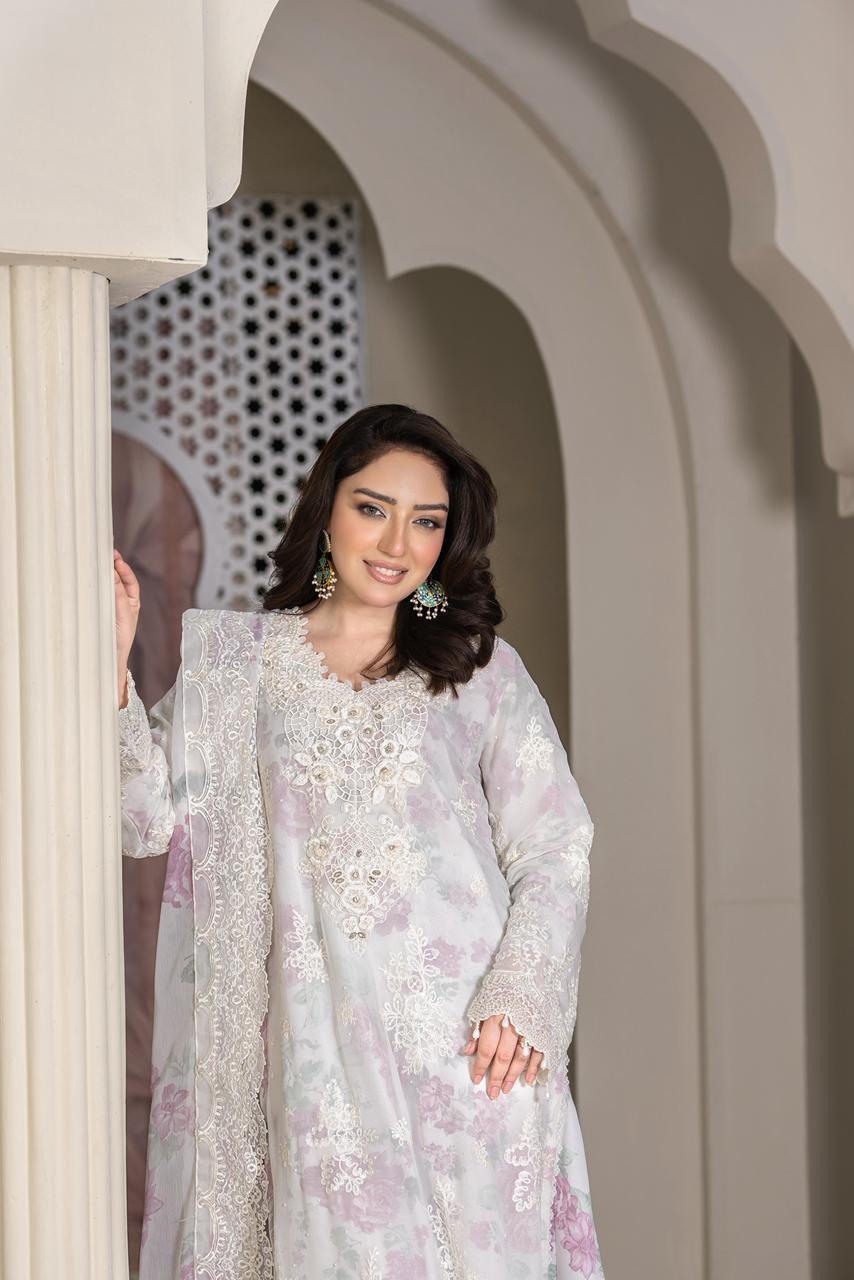 A breathtaking masterpiece, crafted from pure chiffon to bring luxury and grace together. The shirt features intricate thread embroidery adorned with delicate 3D flowers and pearls — beautifully detailed on both the sleeves and the daaman. A soft printed silk lining adds charm and comfort, perfectly paired with matching printed silk trousers. Completing the look is a finely embroidered chiffon dupatta, exuding timeless elegance.