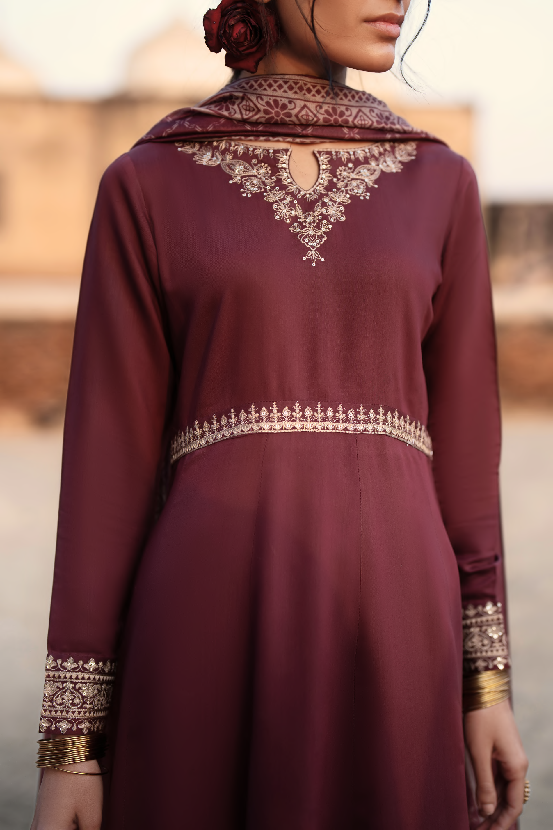 The flowing anarkali silhouette is accentuated with delicate embroidery along the neckline, waistline, and hem, creating a harmonious balance between structure and fluidity.