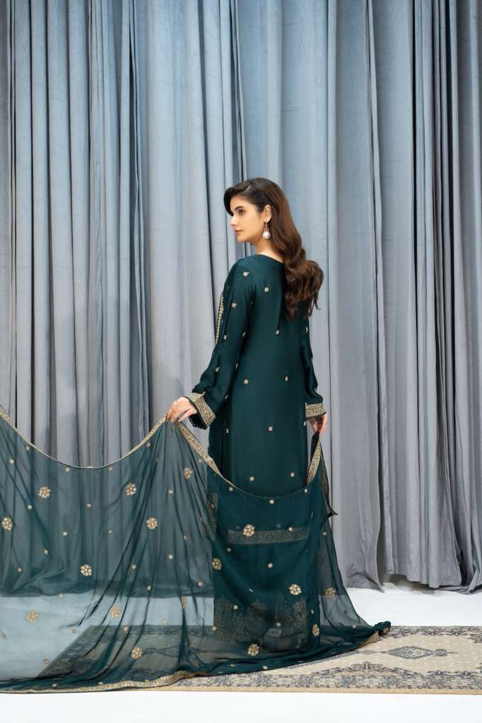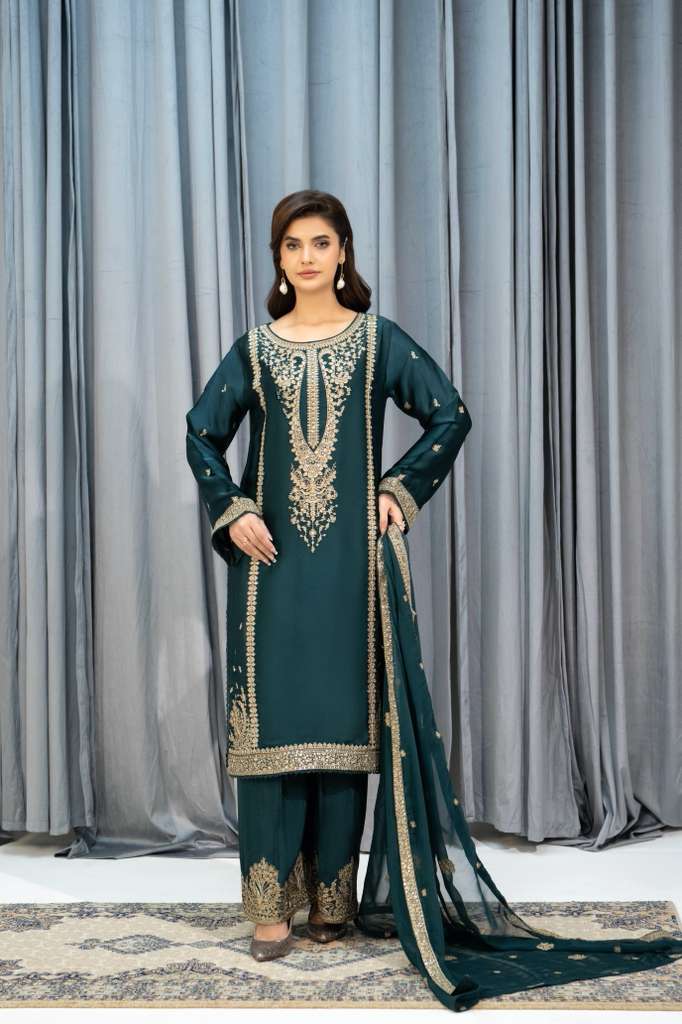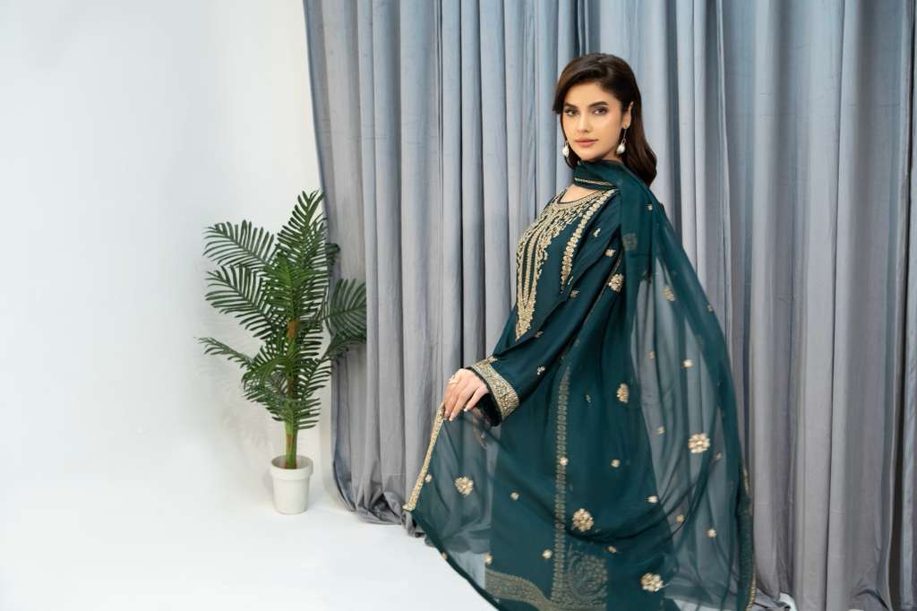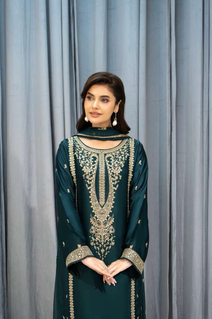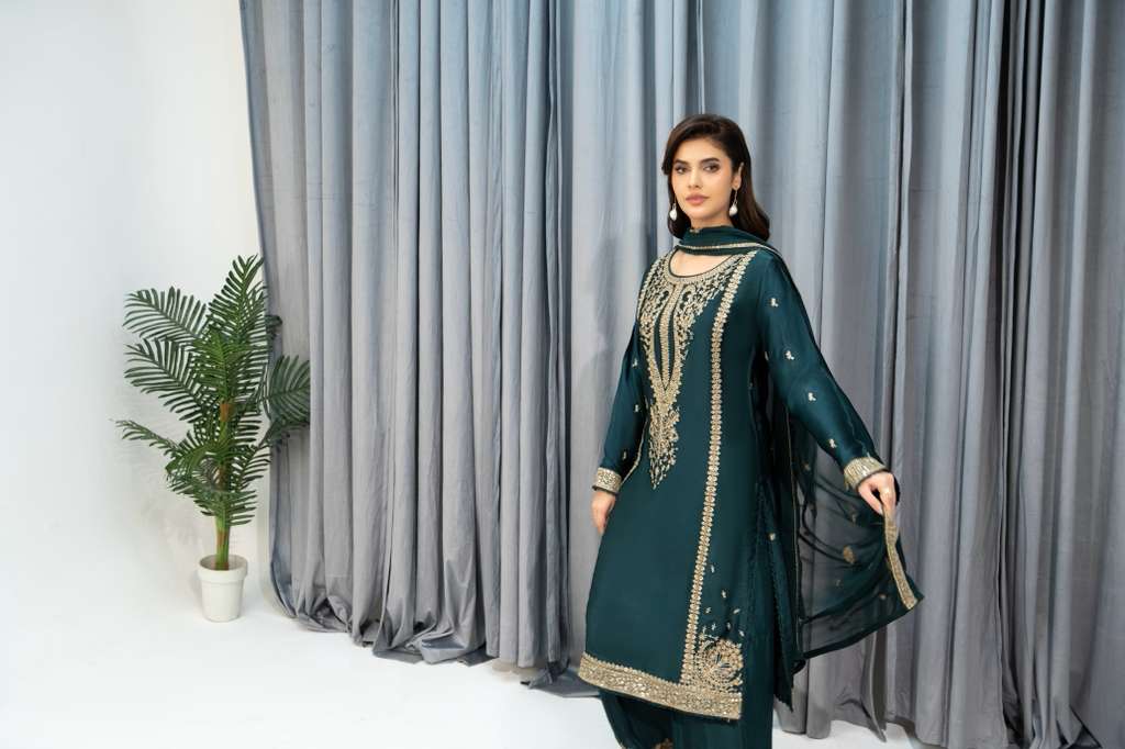 Experience timeless grace with our luxurious silk ensemble. The shirt is beautifully adorned with intricate threadwork, sequin, and tilla embroidery, creating a perfect balance of elegance and charm. It is paired with an embroidered chiffon dupatta that adds a soft, feminine touch. The look is completed with a grip fabric plazo, detailed with an exquisite embroidered patch — making this outfit a stunning choice for festive and formal occasions.