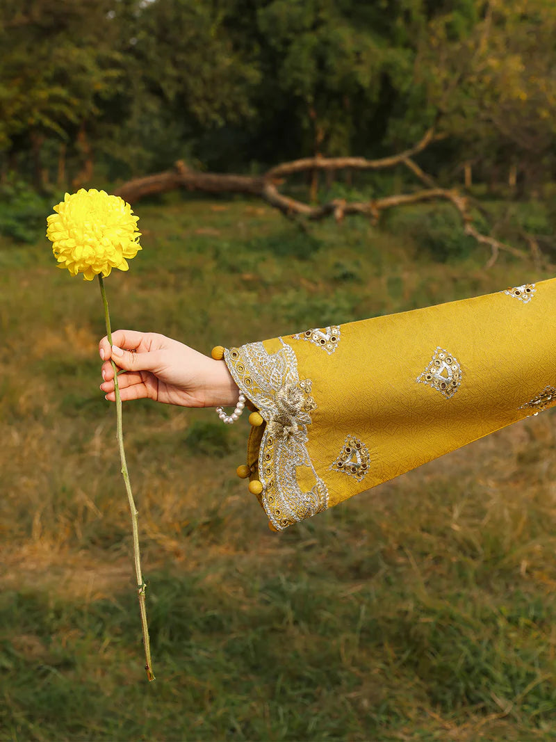 Chikankari jacquard shirt with 2mm spangle embroidery, each stitch a testament to the artistry of handmade adda work, embellished with shimmering beads and intricate cutwork borders