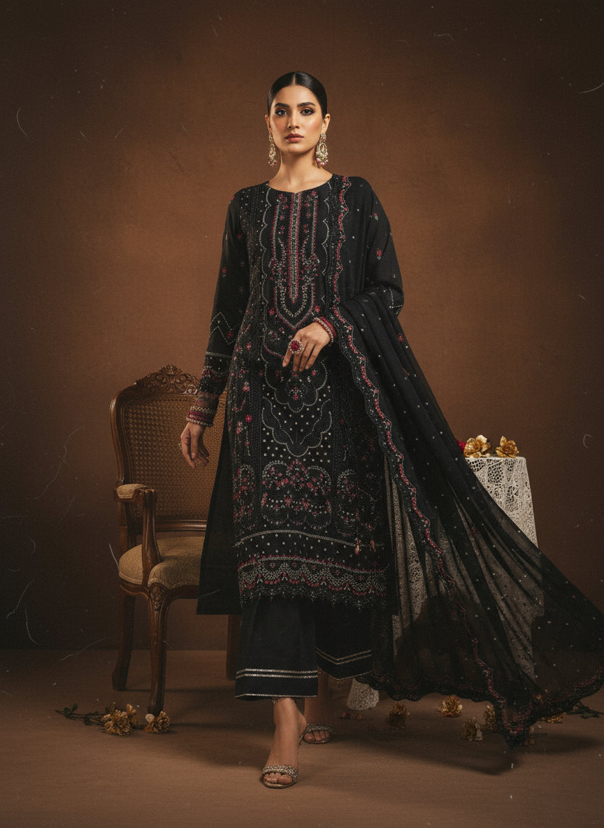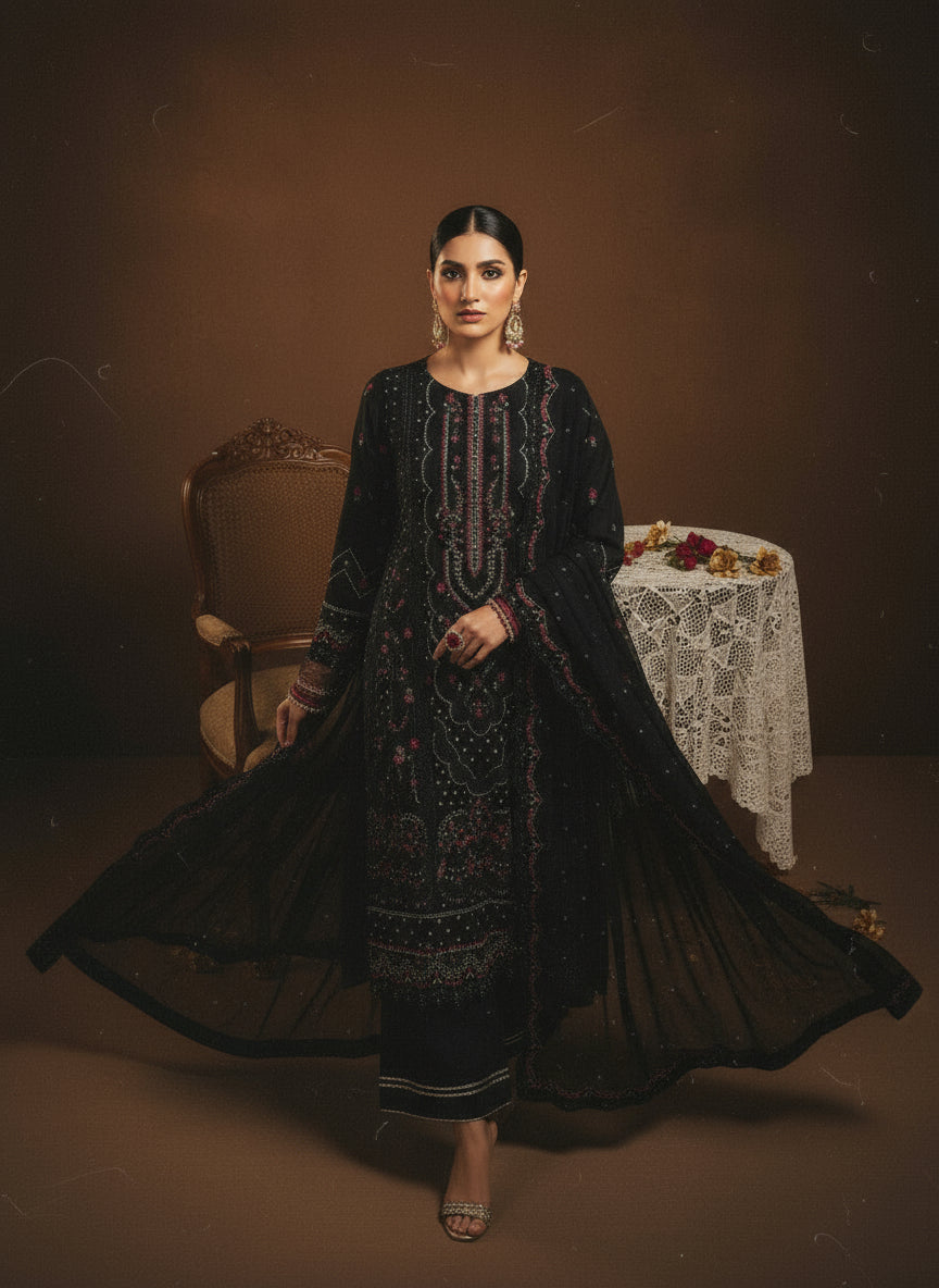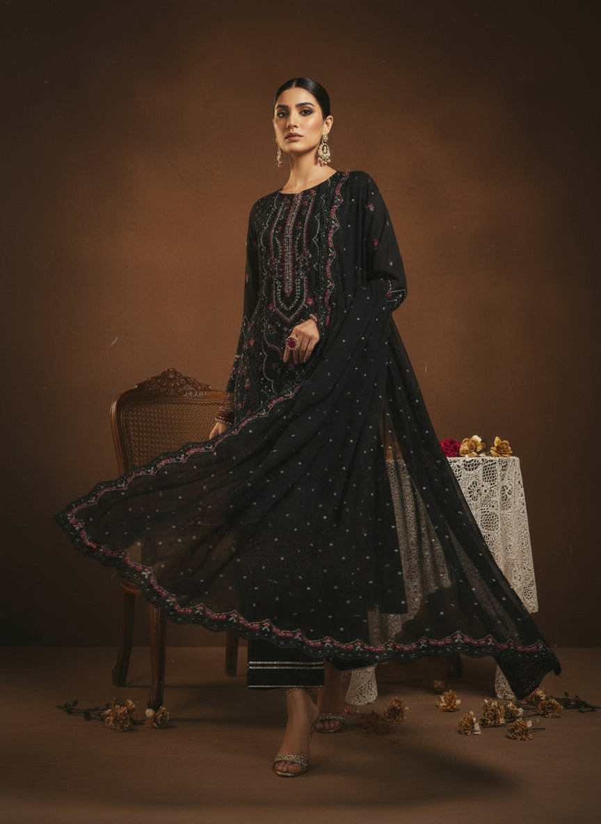 A timeless masterpiece by Sada Bahar, crafted on pure chiffon fabric featuring exquisite thread work, sequins, tilla, and delicate pearl embellishments. The chiffon dupatta mirrors the same intricate craftsmanship, adding a graceful charm to the outfit. Paired with a Russian viscose trouser, this ensemble beautifully blends elegance and sophistication — perfect for any festive or formal occasion.