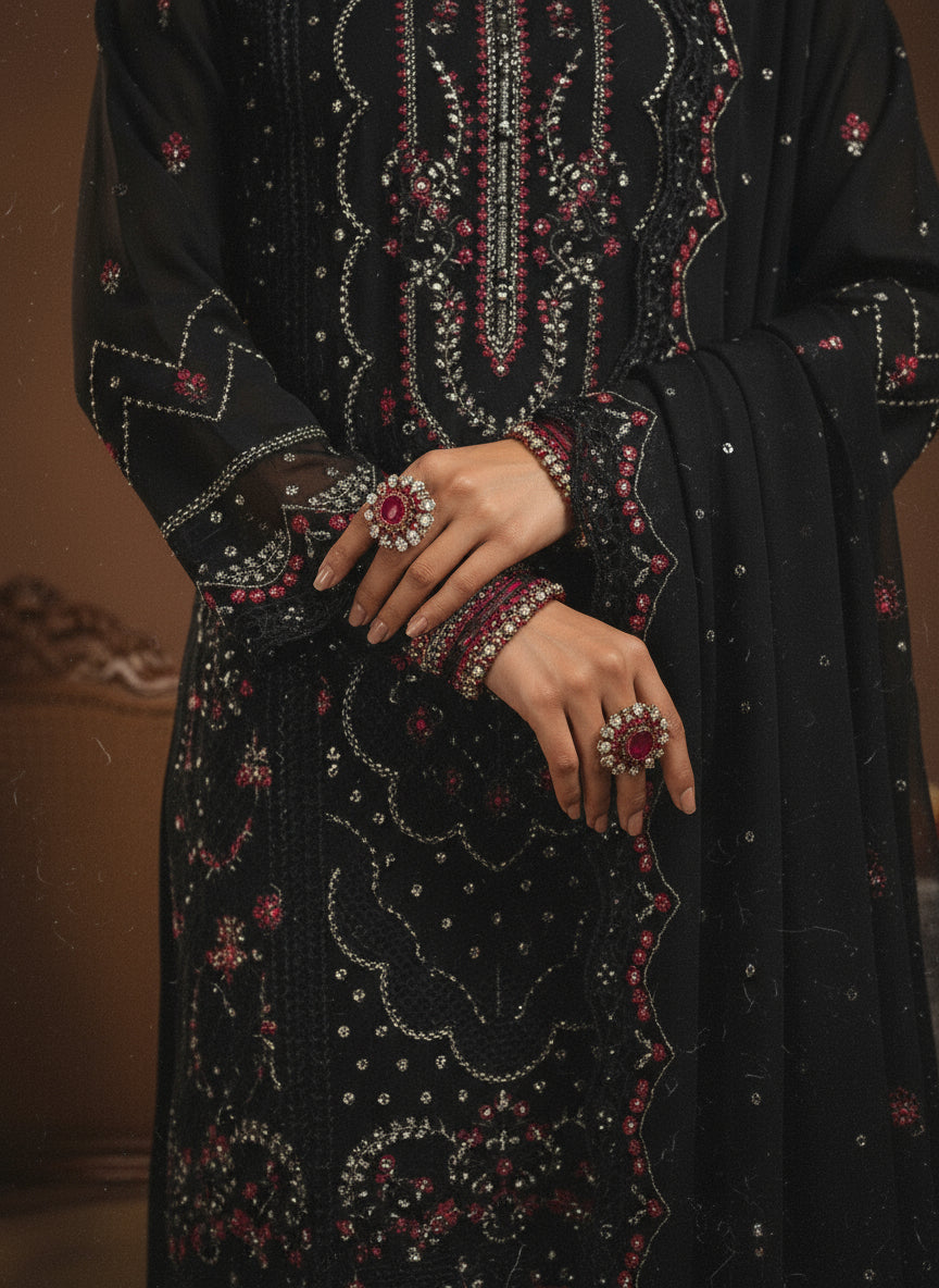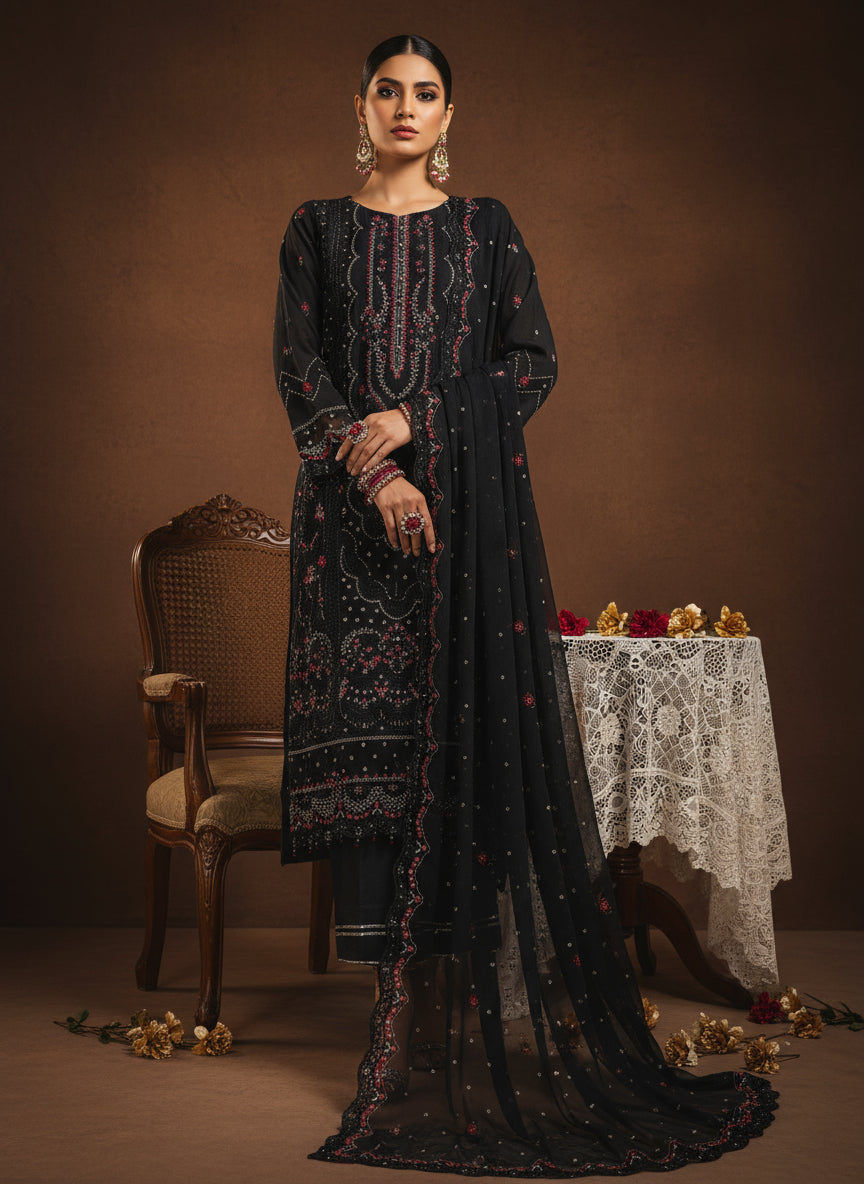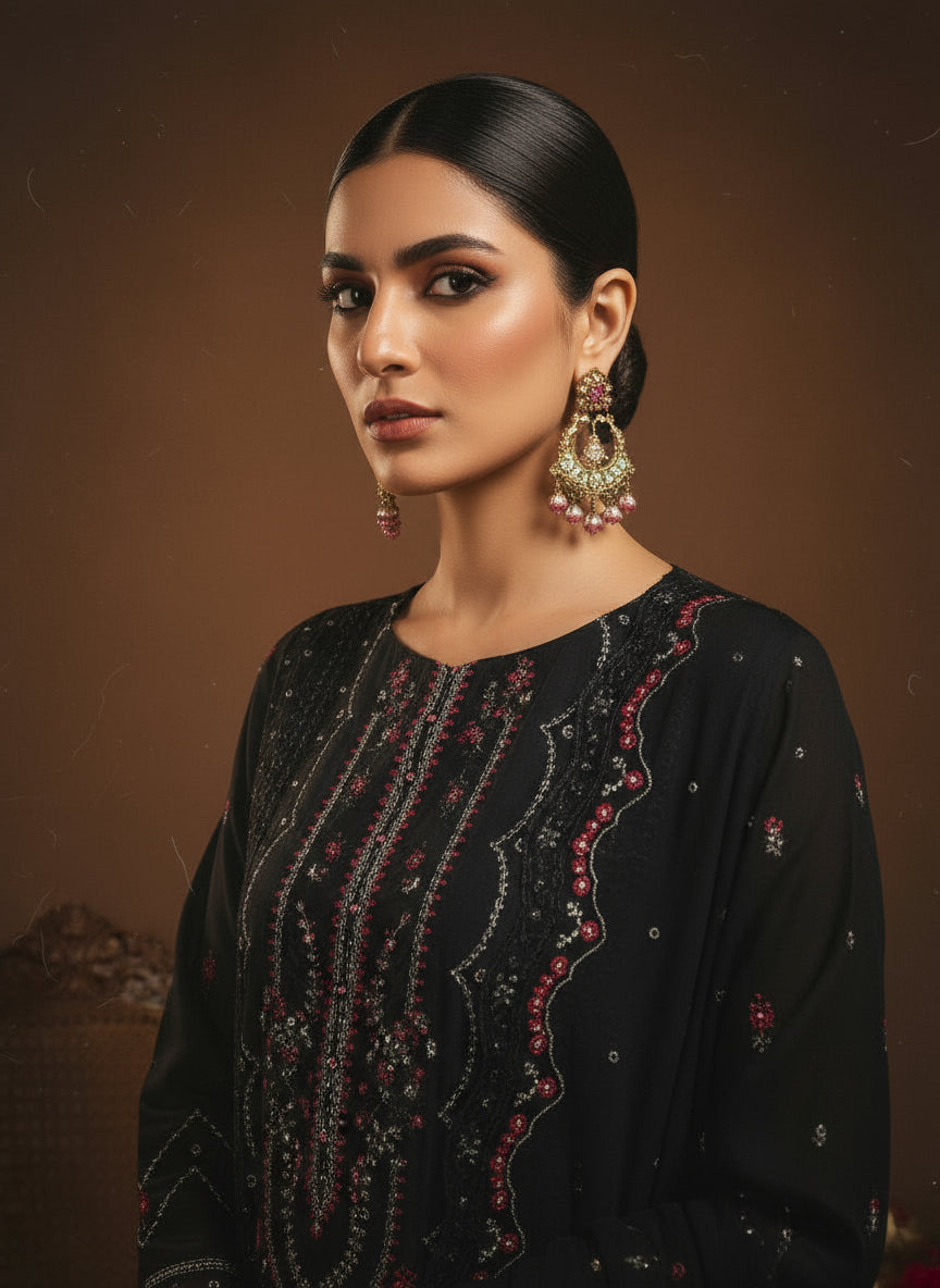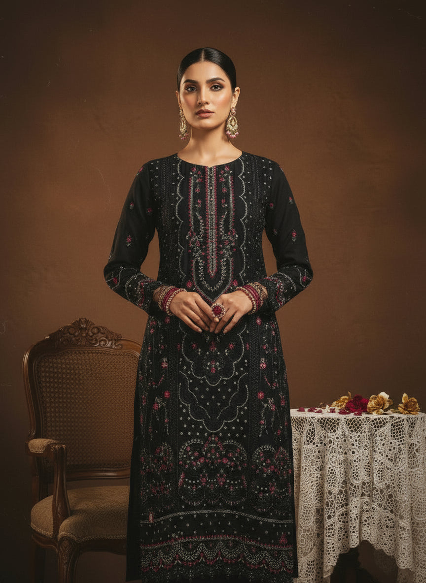 A timeless masterpiece by Sada Bahar, crafted on pure chiffon fabric featuring exquisite thread work, sequins, tilla, and delicate pearl embellishments. The chiffon dupatta mirrors the same intricate craftsmanship, adding a graceful charm to the outfit. Paired with a Russian viscose trouser, this ensemble beautifully blends elegance and sophistication — perfect for any festive or formal occasion.