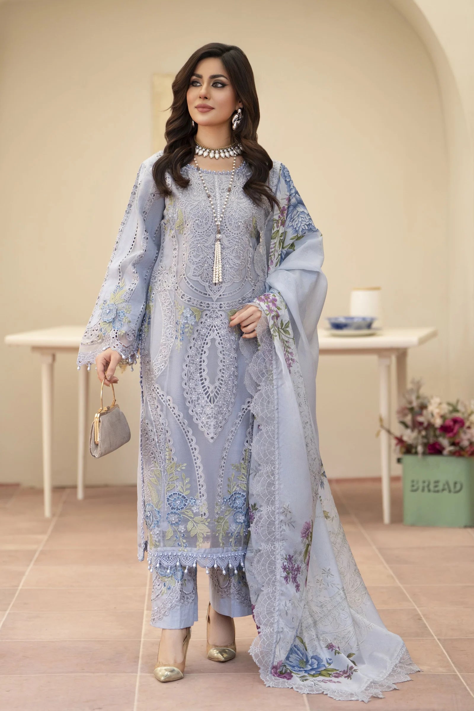 Unveil sophistication with this breathtaking 3pc ready-to-wear ensemble in a serene ice blue hue, part of Silver’s Luxury Collection. The shirt is crafted from premium organza and features intricate embroidery, delicate cutwork, and hand embellishments that give it a truly designer finish. The soft pastel tones are complemented by botanical motifs in lilac, green, and blue, making it perfect for summer soirées, festive gatherings, or daytime weddings. A digitally printed silk dupatta with lace finishing adds an ethereal touch and graceful drape to your look. The outfit is paired with beautifully embroidered straight-leg cotton trousers that blend comfort with couture-level detailing. This formal lawn suit is a must-have for women who love elegance, lightness, and luxury all in one outfit.