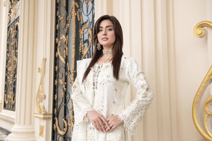 Step into timeless elegance with this ethereal ensemble from Sajni. Design 3524 is a 3-piece ready-to-wear formal dress, perfect for wedding guests and festive occasions. The long shirt is made from premium chiffon, beautifully adorned with intricate embroidery and hand embellishments, including pearls, sequins, and mirror work that shimmer with every step.