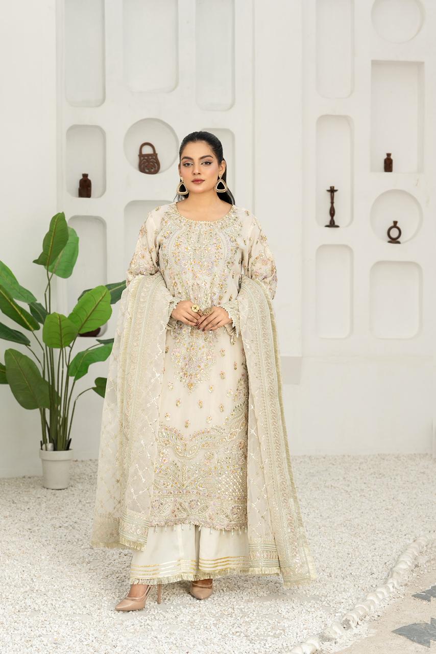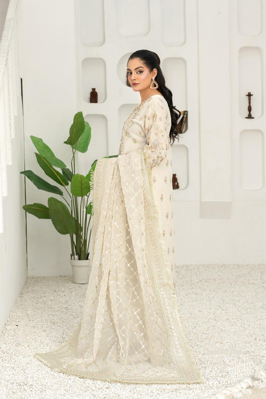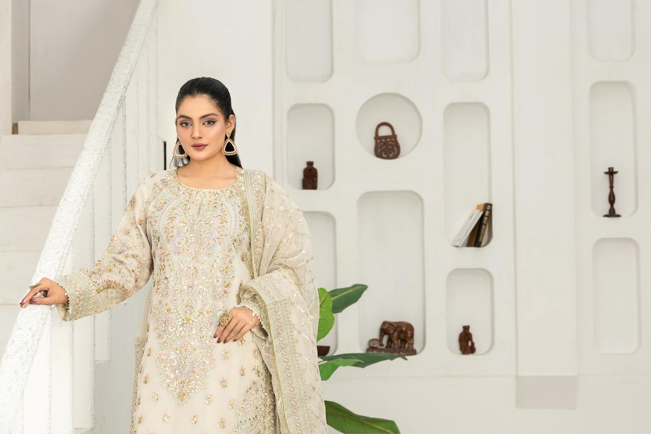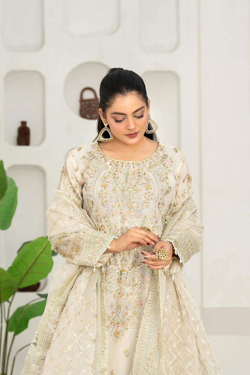 An exquisite organza ensemble featuring a beautifully handcrafted neckline adorned with 3D embellishments, intricate thread work, stones, and pearl detailing. It is paired with a matching organza dupatta and a GT pret fabric palazzo, creating a perfect balance of elegance and sophistication. The intricate craftsmanship and premium materials make this outfit an ideal choice for festive and formal occasions.