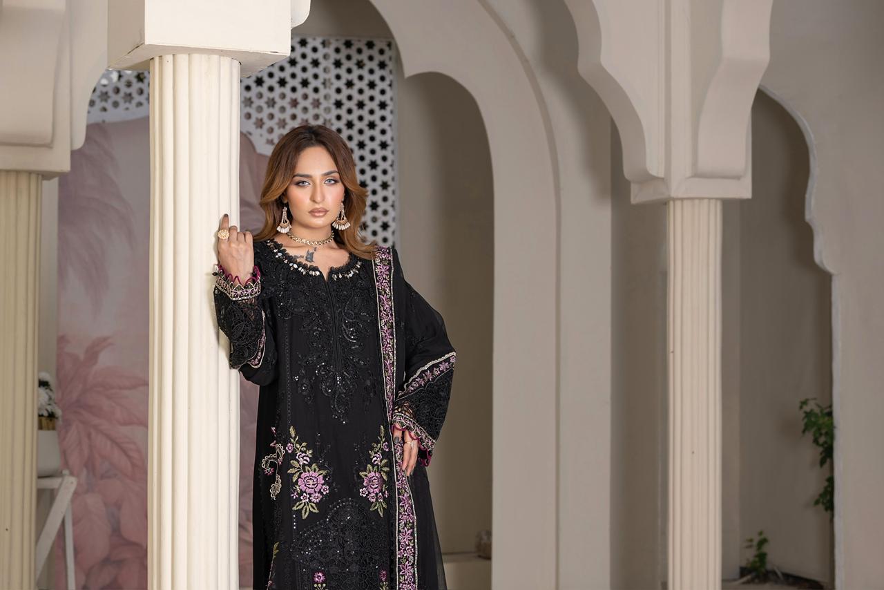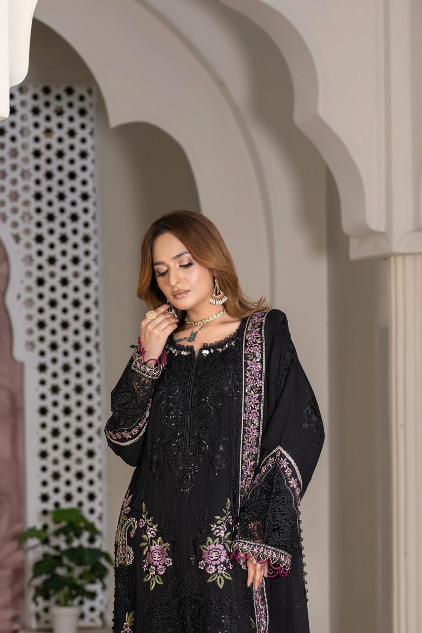 Inspired by the signature elegance of Maria B, this enchanting outfit is crafted from premium chiffon fabric. The neckline is adorned with exquisite handmade stonework, complemented by intricate 3D floral detailing and fine thread embroidery that radiates timeless charm. Paired with a chiffon dupatta, beautifully embroidered throughout and enhanced with heavy embroidery along the side panels, this ensemble perfectly captures a look of luxury and sophistication.