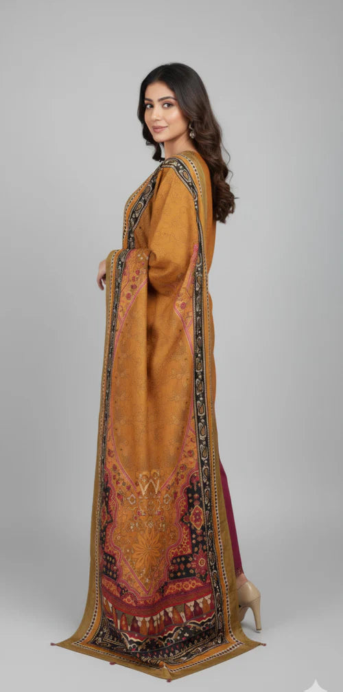 Printed Coarse Khaddar shawl with hem and hanging beads