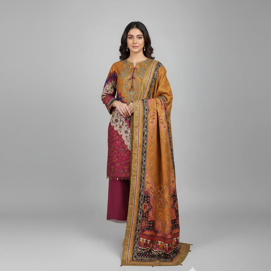 1-Overall Style A classic three-piece ready-to-wear suit, a Pakistani style, designed for a dressy semi-formal look. It features a long, straight Kurta (shirt), a plain salwar, and a large printed shawl ).