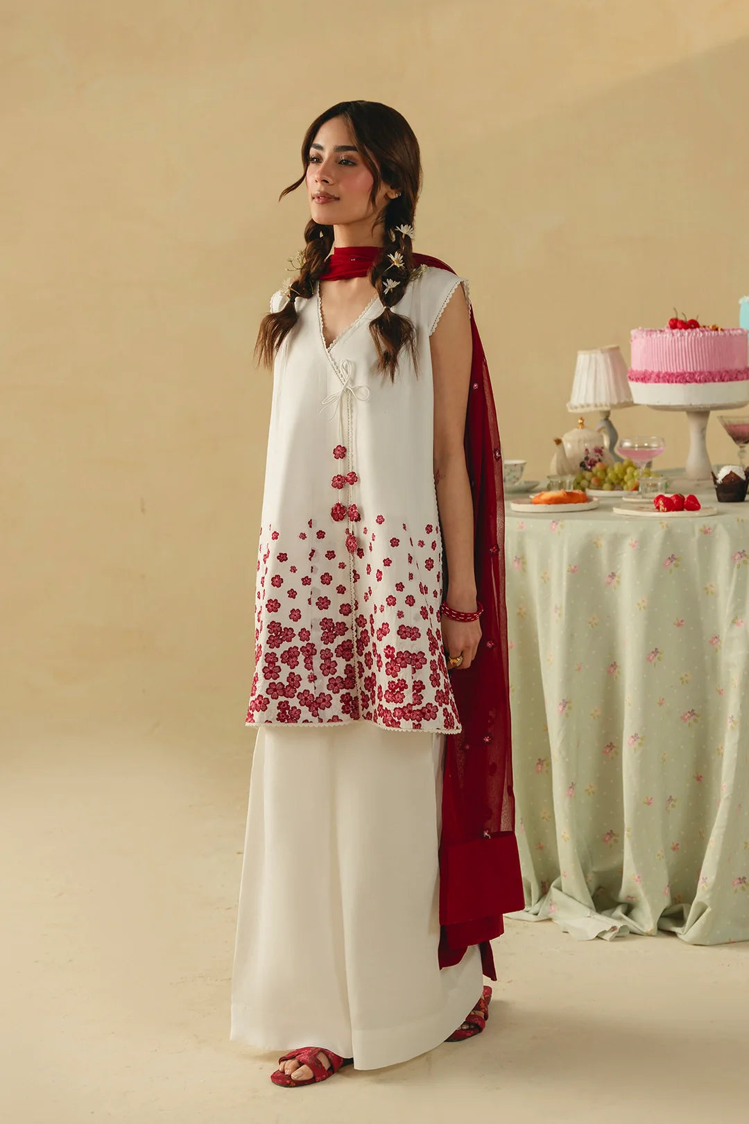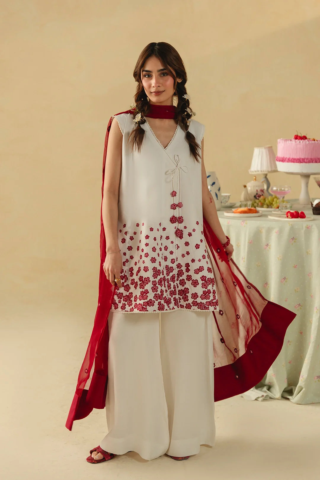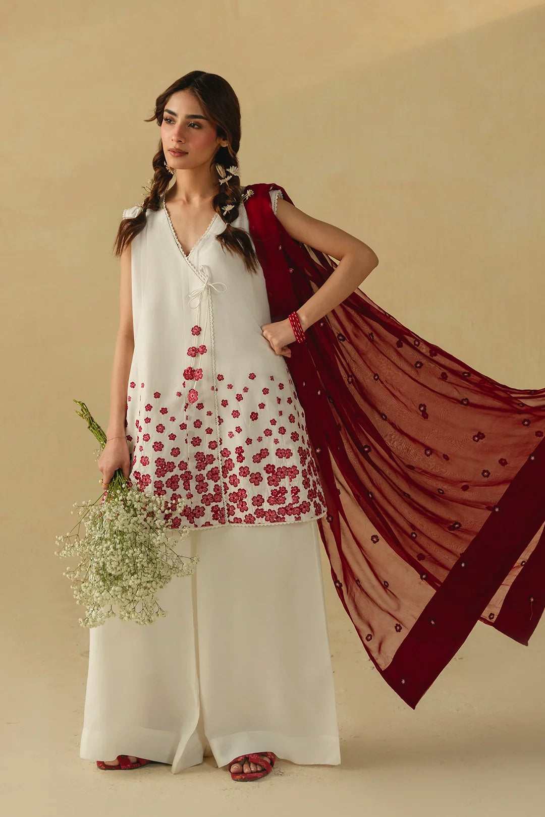 • A timeless three-piece ensemble featuring a short angrakha with a heavily embroidered hem and delicate tassel details. Paired with wide white trousers and a coordinating embroidered dupatta, this design exudes elegance and classic charm.