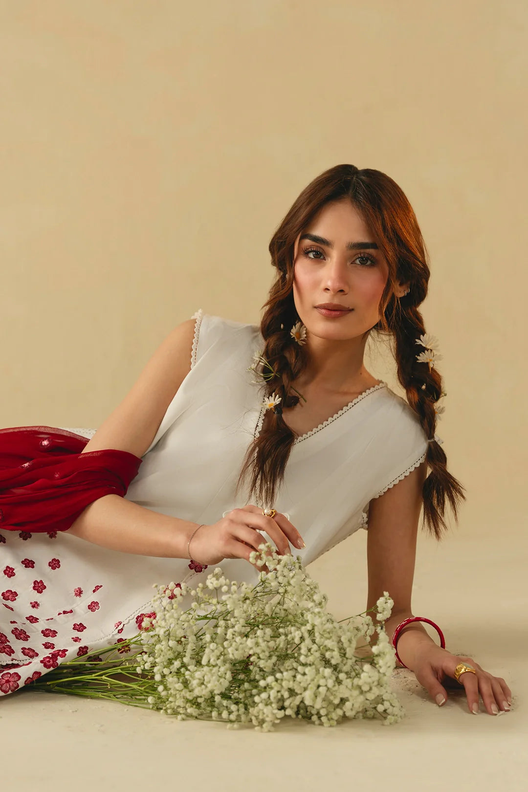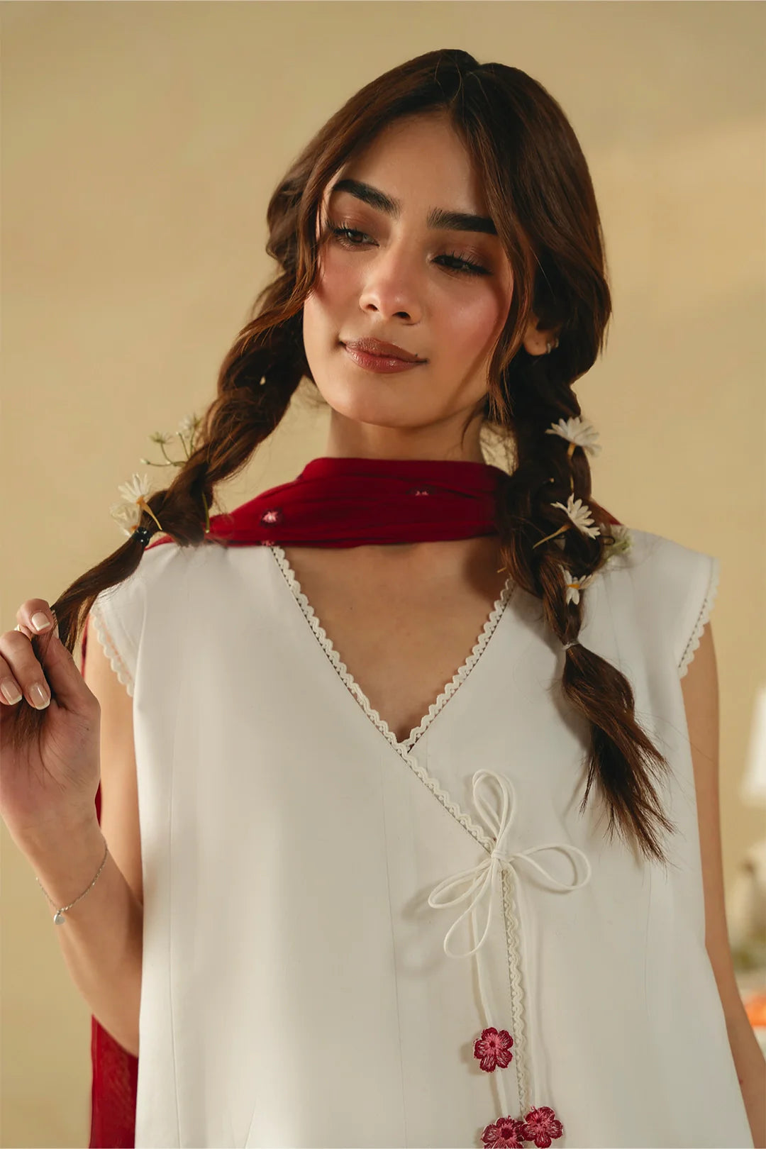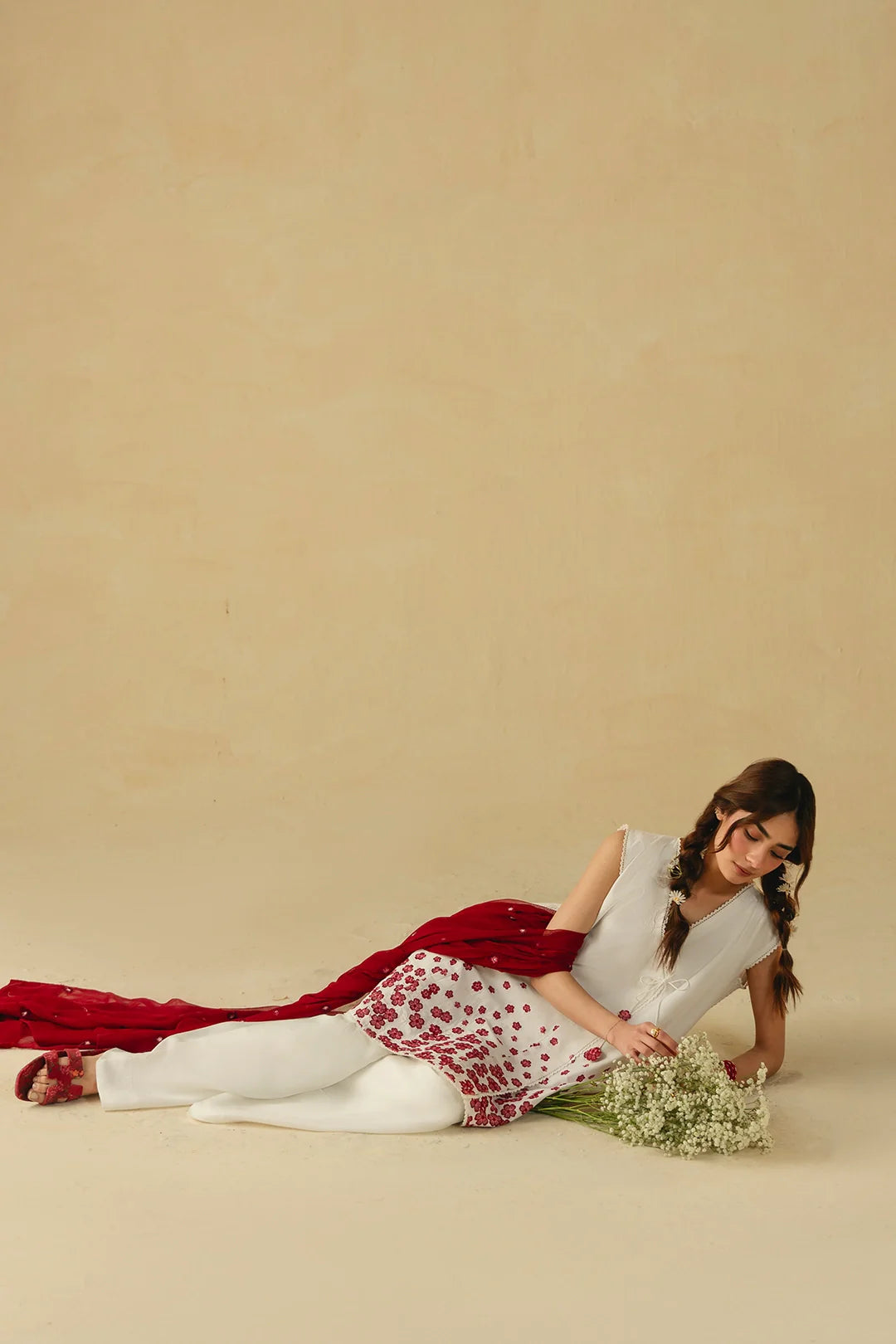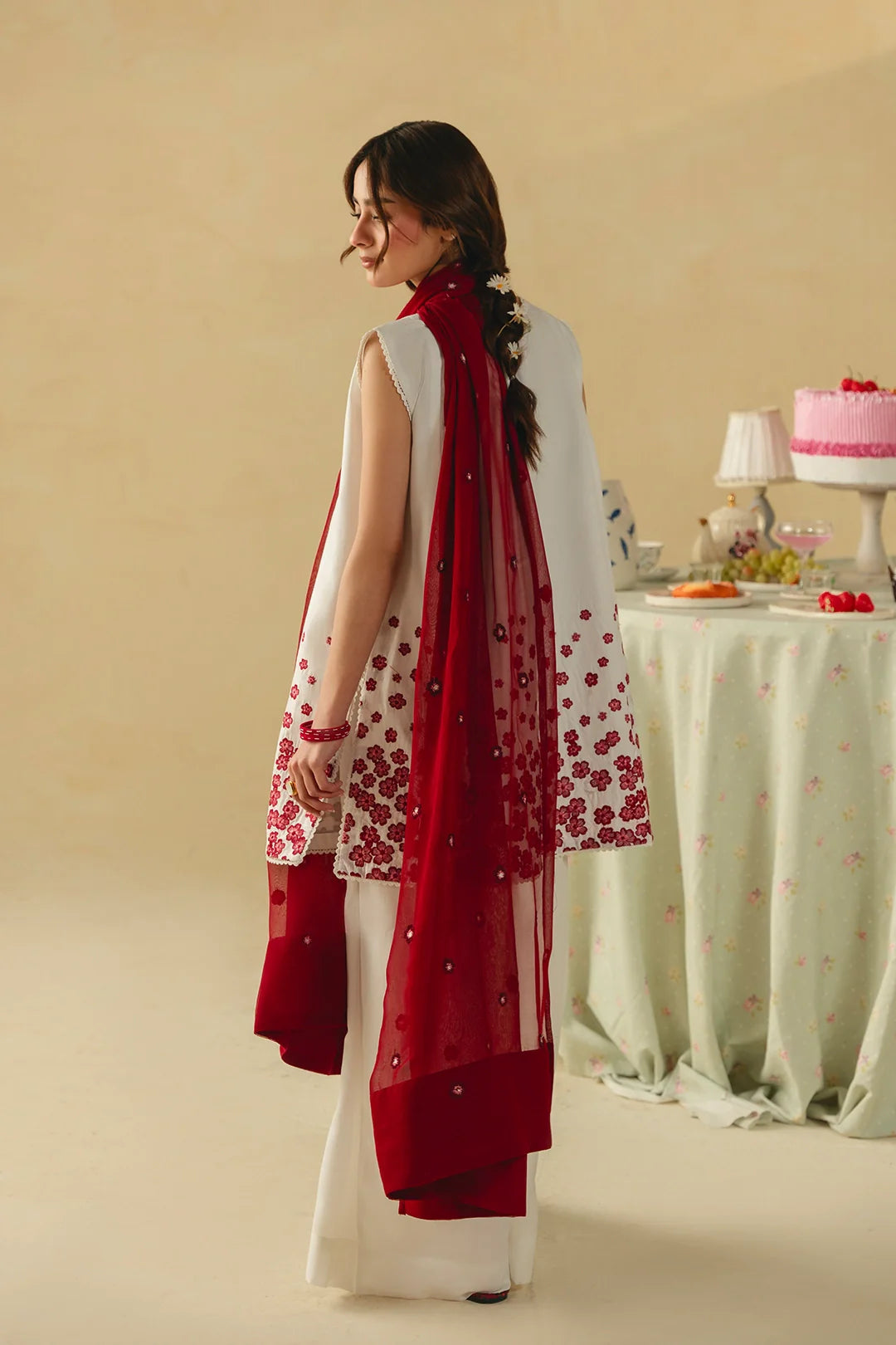 • A timeless three-piece ensemble featuring a short angrakha with a heavily embroidered hem and delicate tassel details. Paired with wide white trousers and a coordinating embroidered dupatta, this design exudes elegance and classic charm.