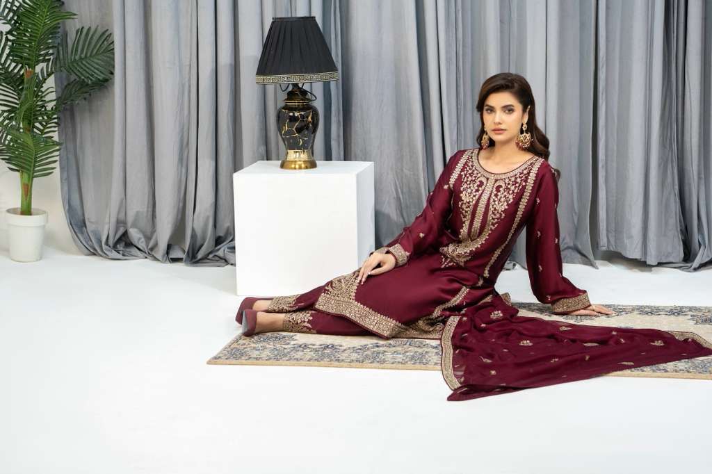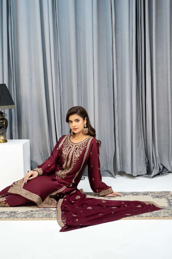 Experience timeless grace with our luxurious silk ensemble. The shirt is beautifully adorned with intricate threadwork, sequin, and tilla embroidery, creating a perfect balance of elegance and charm. It is paired with an embroidered chiffon dupatta that adds a soft, feminine touch. The look is completed with a grip fabric plazo, detailed with an exquisite embroidered patch — making this outfit a stunning choice for festive and formal occasions.