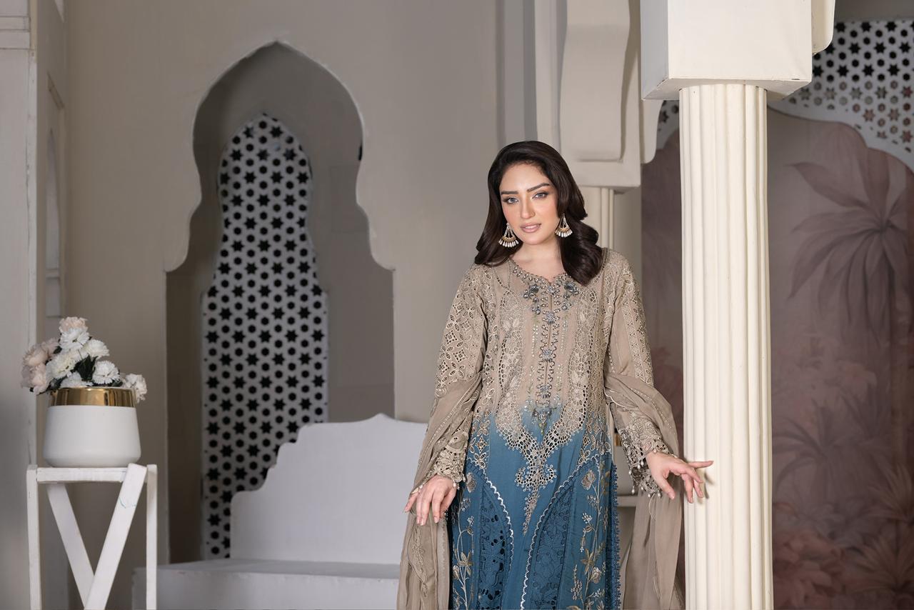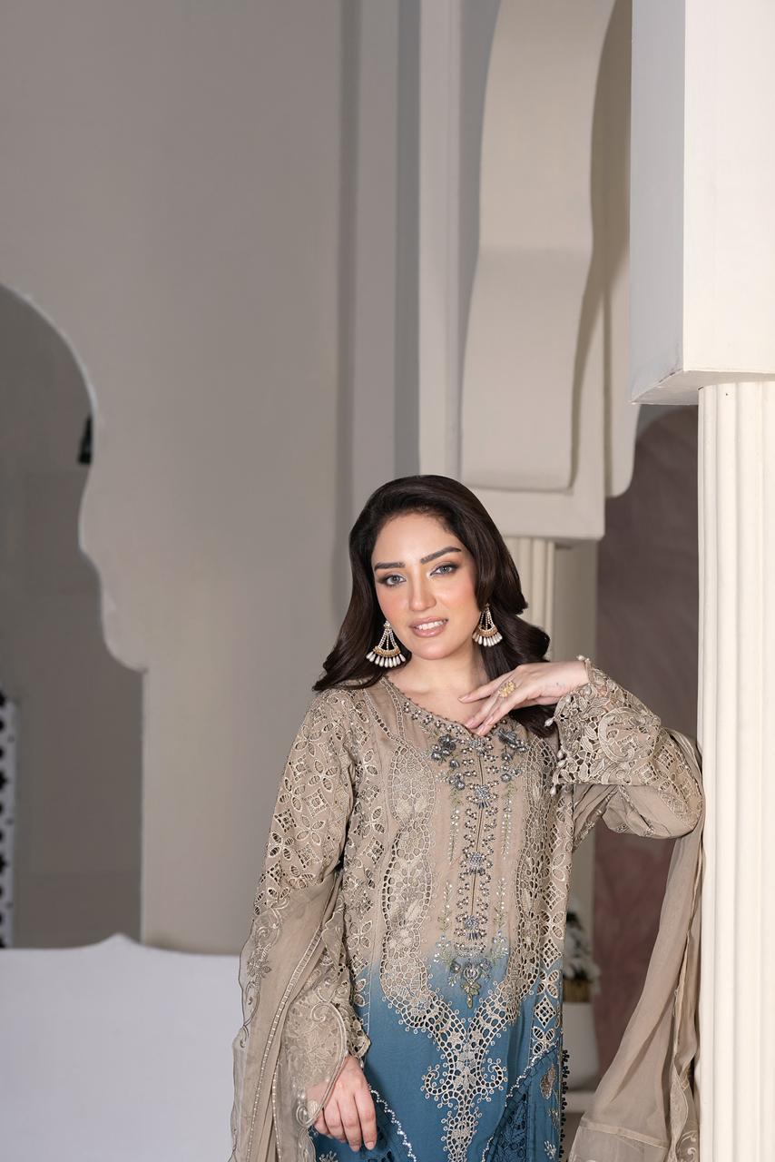 Paired with a premium chiffon dupatta, designed with organza patchwork and embroidery on all four sides, giving it a luxurious finish. The trouser is tailored from fine Russian grip fabric, ensuring both comfort and sophistication — a perfect blend of elegance and craftsmanship.